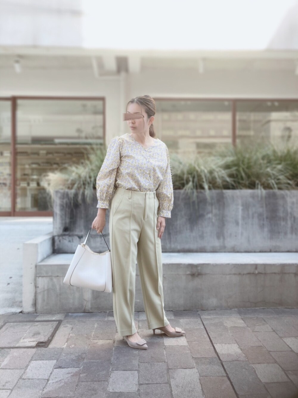 一枚でかわいい花柄ブラウス。パンツと合わせてスッキリと。