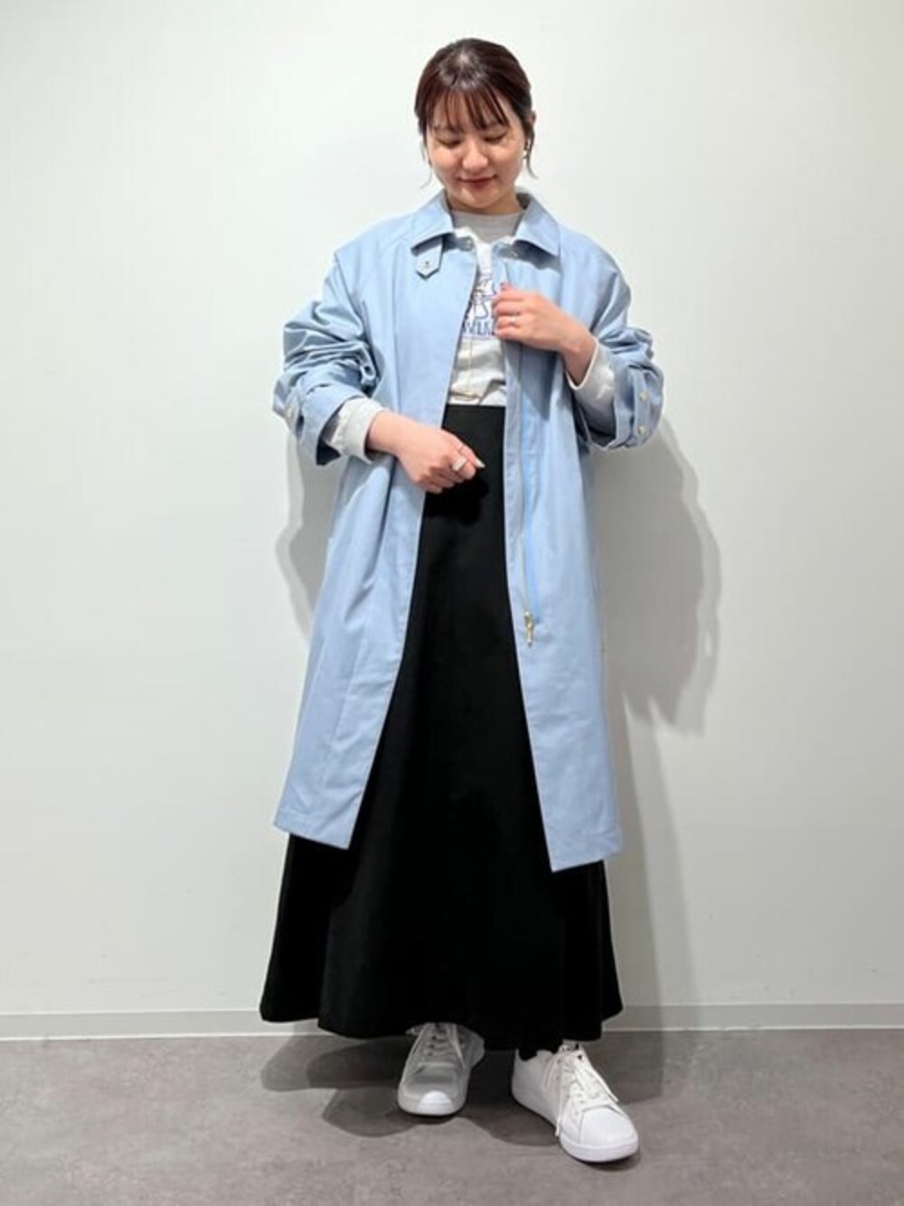 【 コットンボンディングステンカラーコート 】 普段サイズ: S・M / 着用サイズ: M(サンプルサイズ) 綺麗な発色で目を惹くブルーカラー!そこに映えるゴールドの金具がおしゃれ見えします。 やや光沢感がありつるっとした生地感です。袖や見頃は少し大きめのサイズ感なので、厚手のトップスの羽織りとしても問題なく使えます。 後ろにスリットと、横側はボタンを開けるとスリットになるので、小さいさんもバランスがとりやすくのっぺりした印象になりません◎ ※サンプルサイズ着用のため、丈や袖が数cm長めです。 【 コットンウェザーワッシャーワンピース 】 普段サイズ: S・M / 着用サイズ: M(サンプルサイズ) やや厚めで張りがあるので透け感はありません。表面はマットで日常着に取り入れやすい素材感です。 分量感があり裾に広がりがありますが、ウエスト周りがすっきりしているので細見え効果があります◎ ウエストのシャープさを活かして、厚めのニットよりはTシャツやブラウスをインしてお召しいただくのがおすすめです! ※サンプルサイズ着用 着丈+約4cm