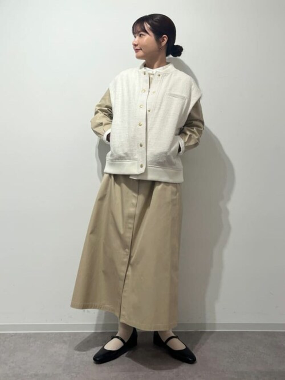 【 ブッチャーツィードベスト 】 普段サイズ: S・M / 着用サイズ: M(ワンサイズ) トレンドのスポーティな形でありながらも、ツィード素材のため大人上品に決まる新鮮なベストです。 マットな表面感と色合いが優しい印象です。しっかりとした生地ですが、アーム部分にボリュームがないニットであれば羽織っても余裕のあるサイズ感です。ヒップは隠れない長さで、154cmで骨盤あたりの着丈です。 【 ノーカラーワンピース 】 普段サイズ: S・M / 着用サイズ: M チノパンツのようなしっかりとした素材で、マットな表面感です。 厚みのある生地なので透け感は全くありませんが、バスト部分が少しコンパクトに感じたためMサイズを選びました。 いつもSSサイズの方や華奢な体型の方はSサイズがおすすめですが、私と同じような体型でバスト部分が気になる方はMサイズがおすすめです! S・M両サイズとも後ろにタックが入っているため、背中や腰、ヒップ周りのシルエットは全く気になりませんでした◎
