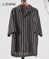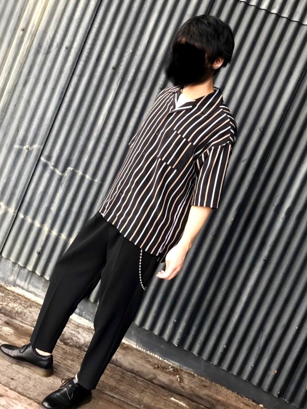 LIDnMのオープンカラーシャツが届いたので着てみました! インナーはJUNREDのTシャツを着ています 後ろの壁もストライプでした😉