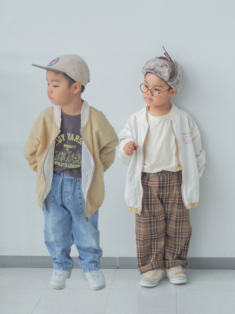イエロー系のブルゾンを着用したキッズの秋コーディネートの1枚目の写真