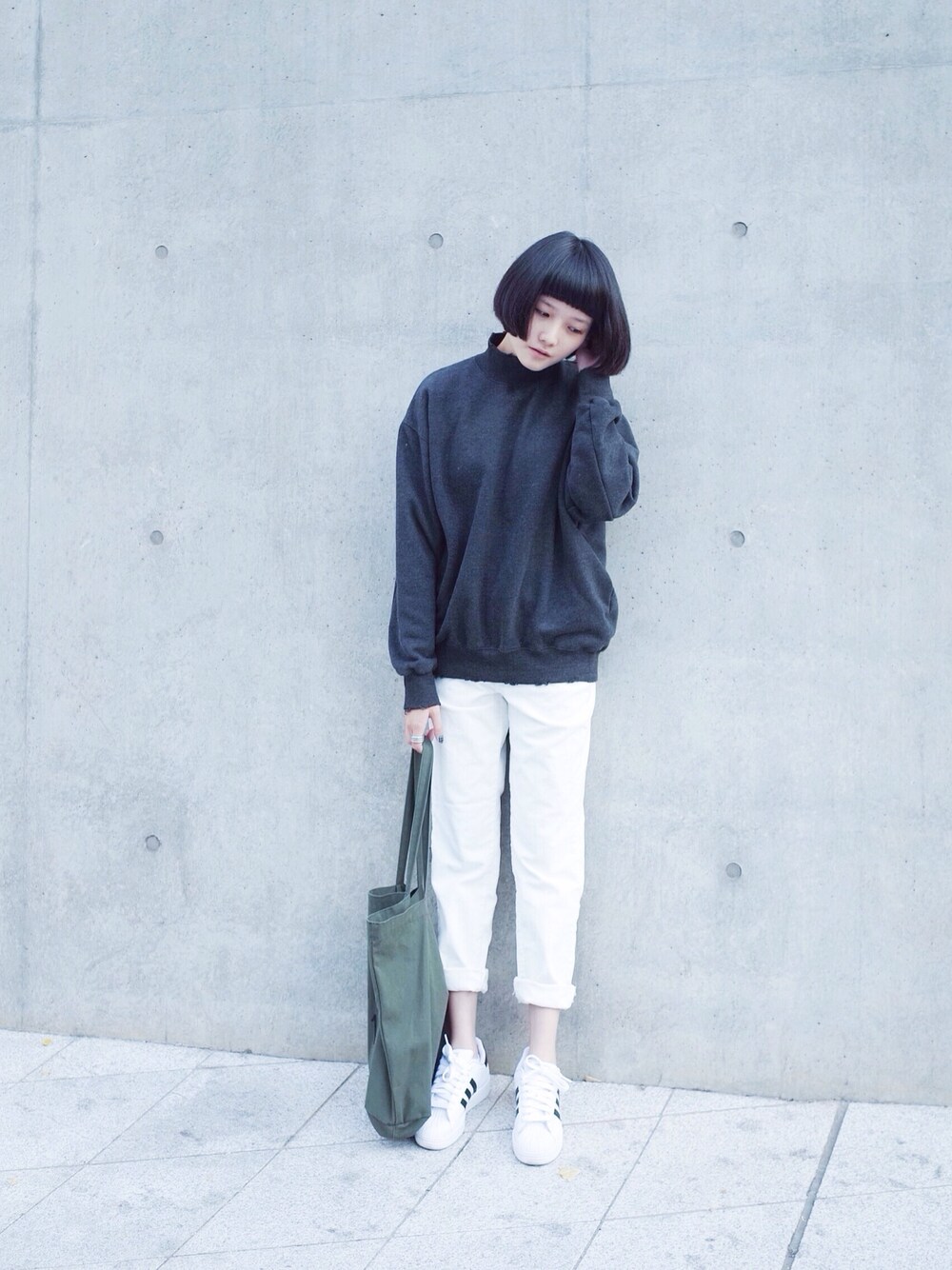 グレー系のTシャツ/カットソーを着用したレディースの冬コーディネートの1枚目の写真