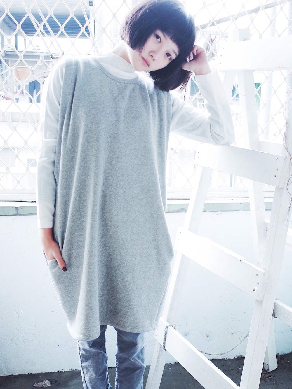 グレー系のワンピースを着用したレディースの冬コーディネートの1枚目の写真