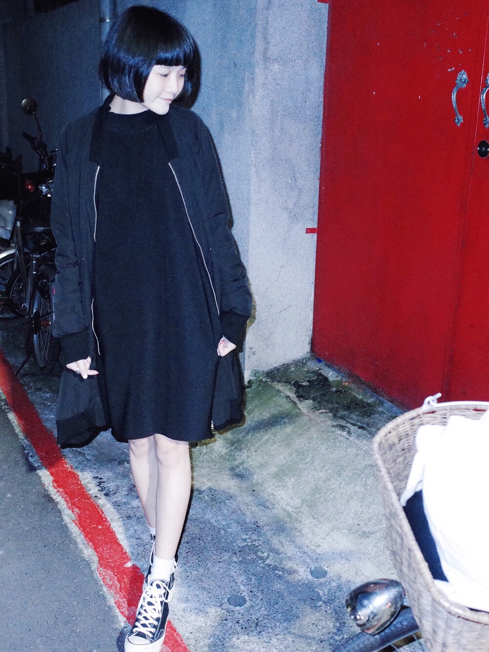 ブラック系のスニーカーを着用したレディースの冬コーディネートの1枚目の写真