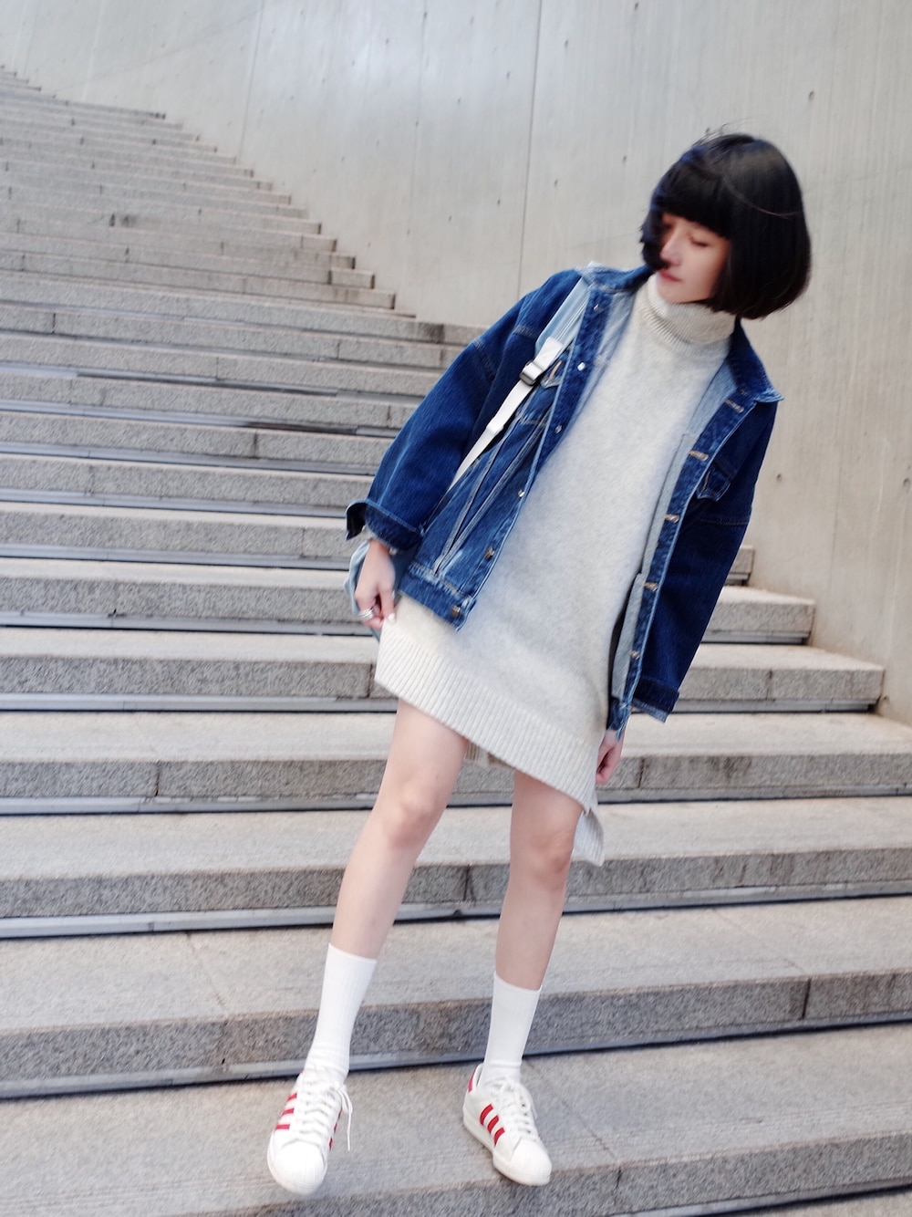 ホワイト系のスニーカーを着用したレディースの冬コーディネートの1枚目の写真
