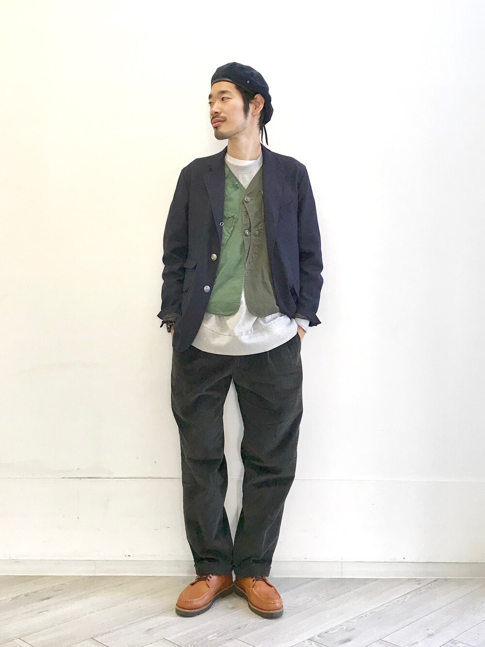 本年も宜しくお願い致します。 ブレザーに2プリーツのコーデュロイパンツ。全体的にワークなアイテムを散らしてそれに合わせたサイズ感を意識しています。