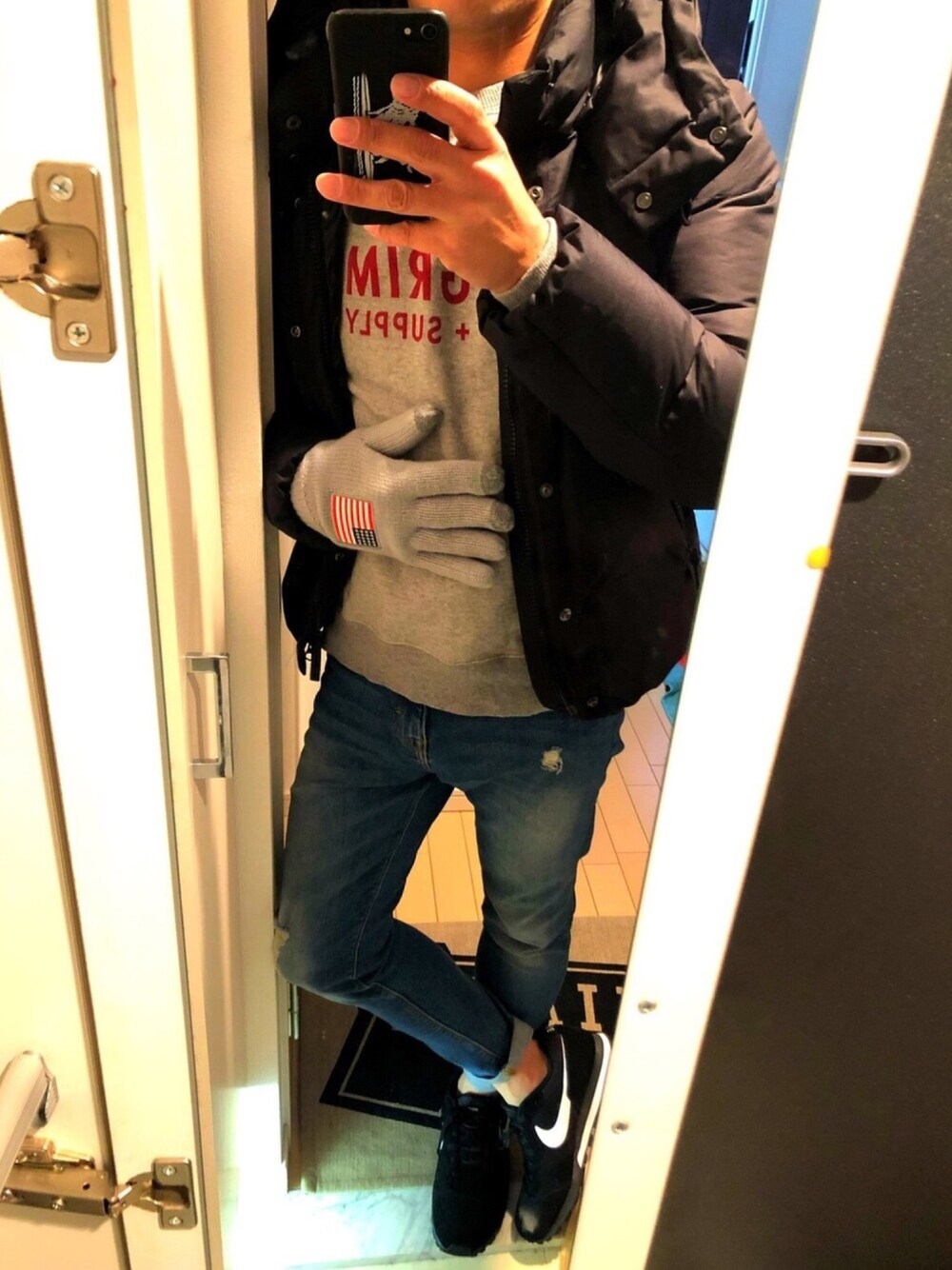 久しぶりのpic✌️ 冬服ー!! 今日届いたチャンピオンの星条旗柄の手袋つけてみたー!!アーバンリサーチのソニーレベルのやつ!!