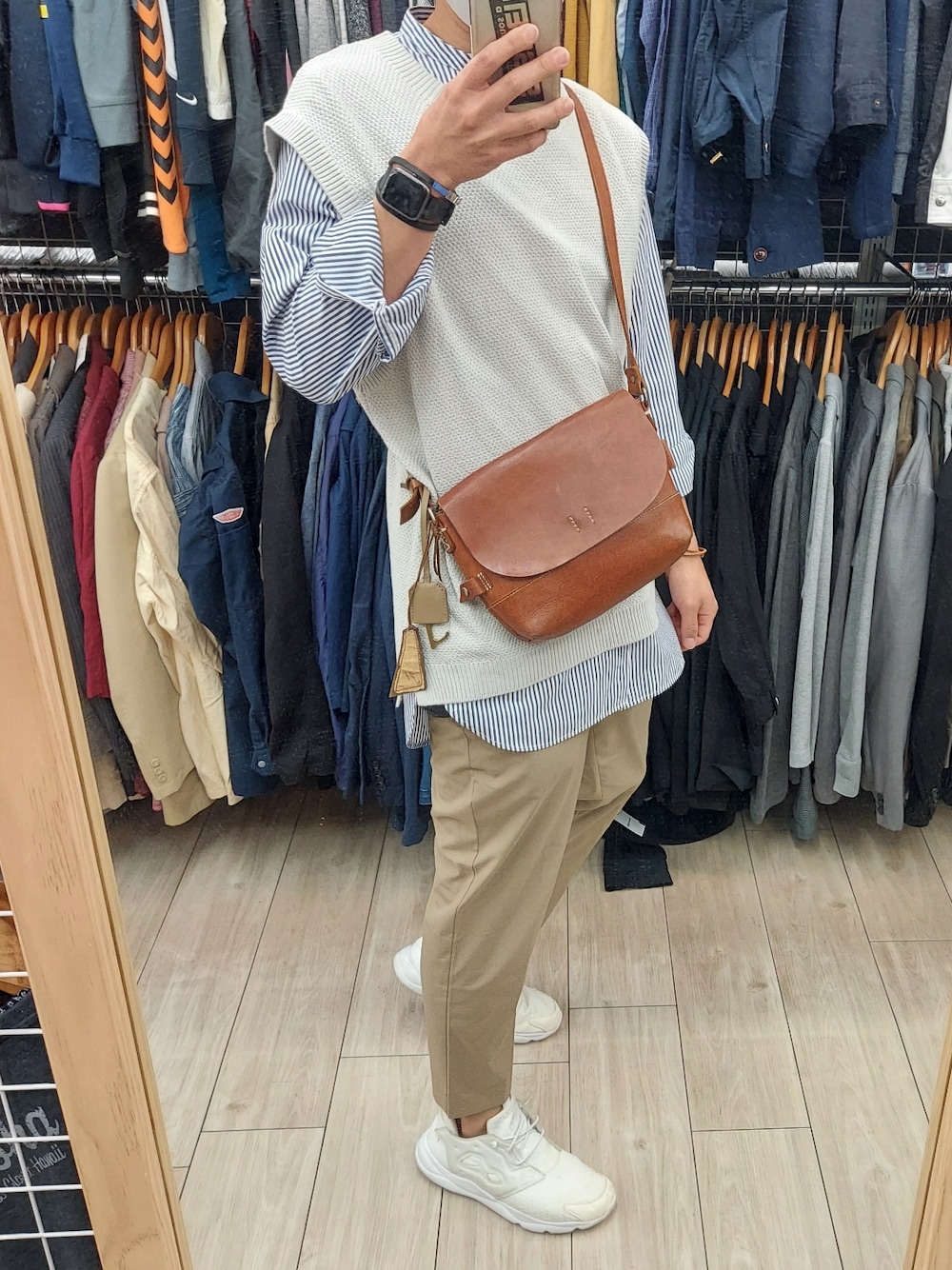 閲覧ありがとうございます。 ベージュ、ホワイト、ブルーを使った清潔コーデ ストライプバンドカラーシャツに淡色のベスト、そしてベージュのパンツ 足元は白スニーカー ショルダーバックやブレスレットの小物で程よくアクセント。 とにかく爽やにを意識したコーデです。