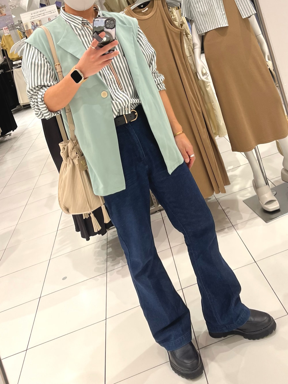 いつもありがとうございます 大人カジュアルコーデ グリーンストライプシャツに同系色のジレベスト フレアデニムに厚底ローファー 巾着ショルダーにループタイ タックインでウェストマークをベルトで 爽やかに、でもキレイめは忘れずに