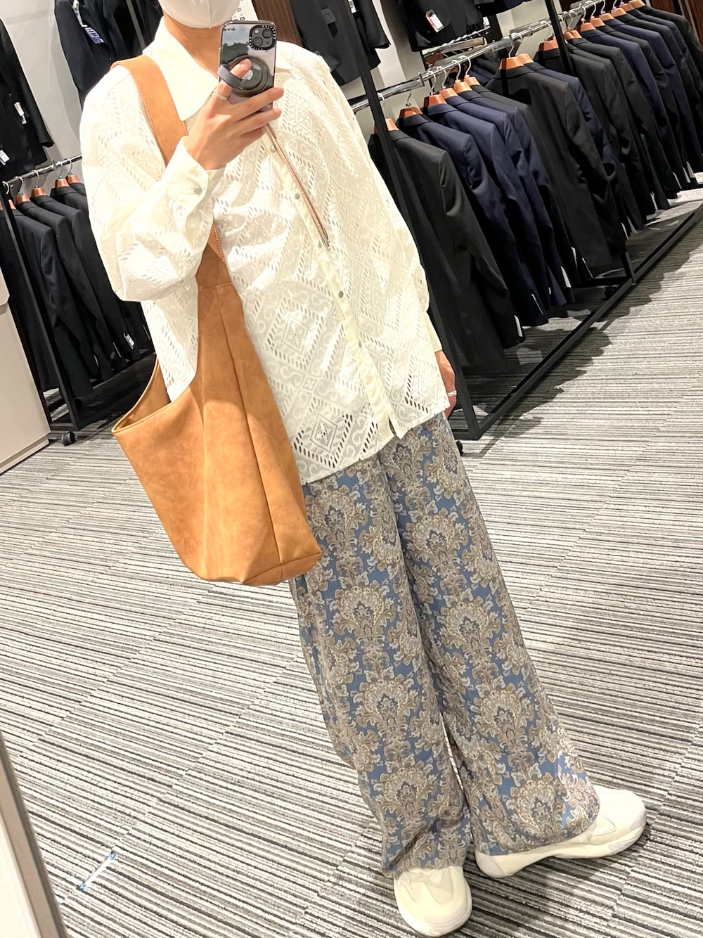 いつもありがとうございます レースシャツに柄パンツ 大きめショルダーにスニーカー ループタイ 夏にピッタリな涼しげカラーを選びました
