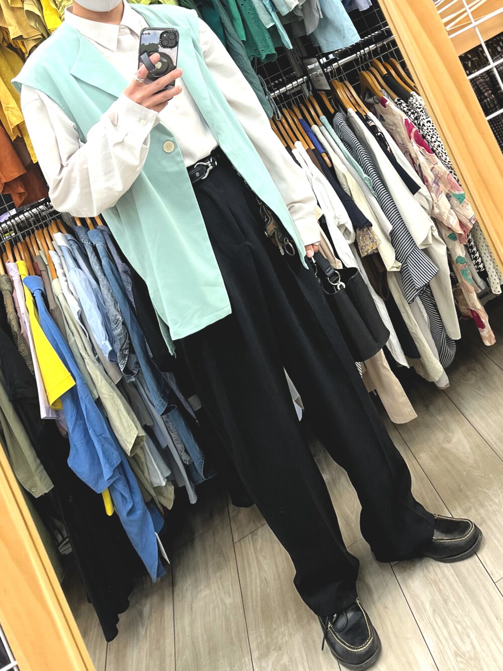 いつもありがとうございます シアーシャツにジレ スラックスにローファー ハンドバッグにタックインで腰回りをスッキリ 淡色ベストで春らしく