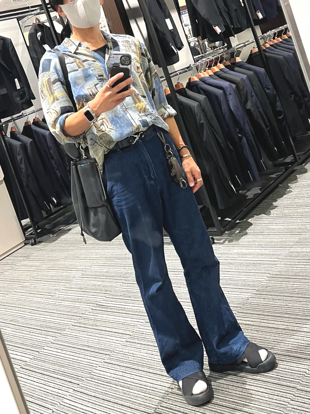 いつもありがとうございます 柄シアーシャツにフレアデニム ショルダーバッグにサンダル 近くの学校イベントに参加して来ました