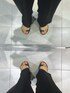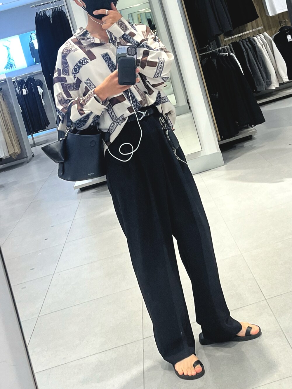 いつもありがとうございます 柄シャツにワイドスラックス ハンドバッグにサンダル タックインしてハイウェストに