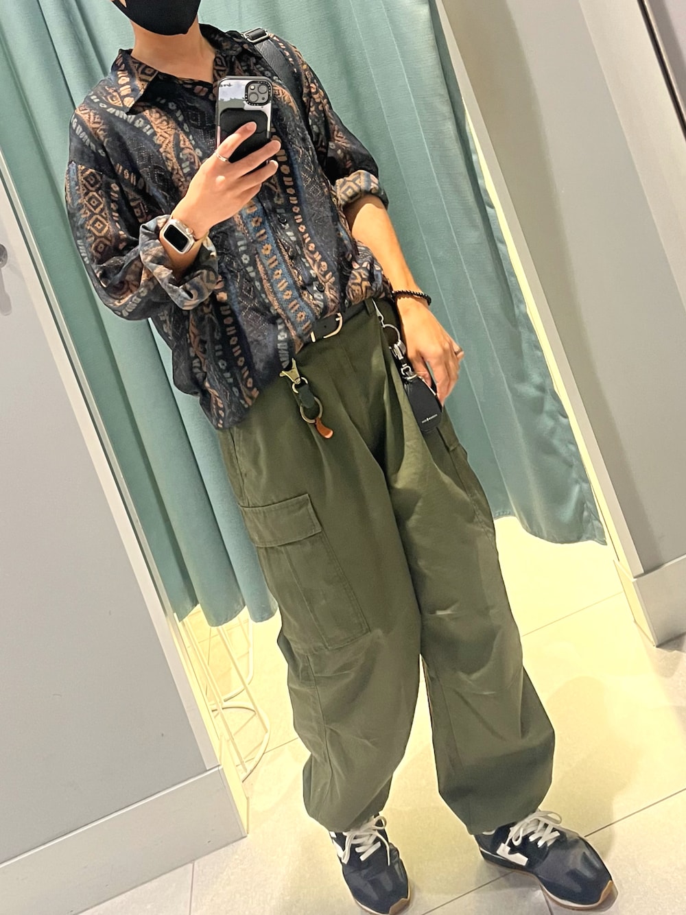 いつもありがとうございます 柄シアーにカーゴパンツ ショルダーバッグにスニーカー 袖捲りと裾を絞ってタックインすれば完成