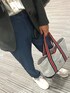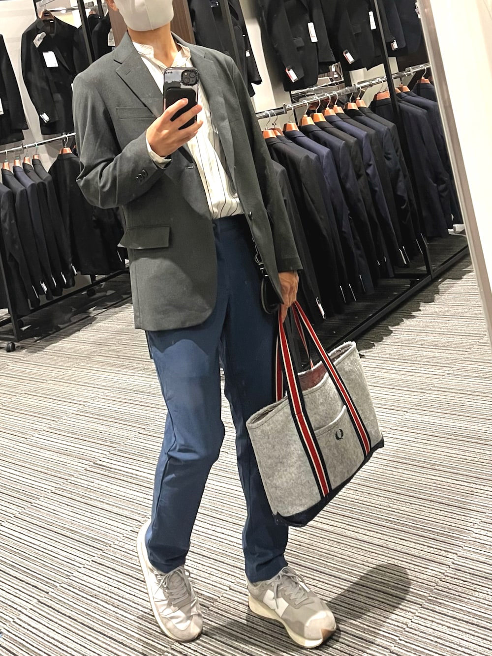 いつもありがとうございます バンドカラーシャツにジャケ スラックスにスニーカー トートバッグ