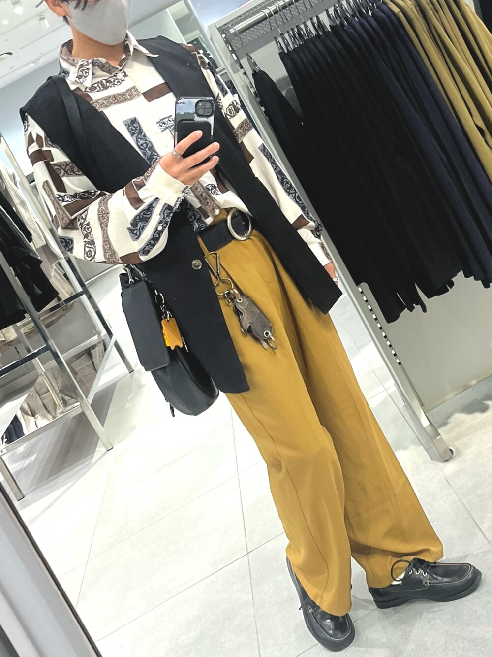 いつもありがとうございます 柄シャツにジレベスト カラーパンツにローファー ショルダーバッグにベルト