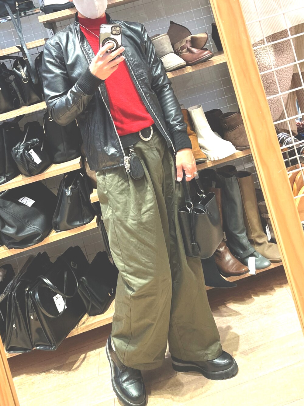 いつもありがとうございます モックネックニットにレザーブルゾン ワイドパンツに厚底ローファー ハンドバッグとベルト タックインでネックレスを装着 そういや断髪してきました笑っ