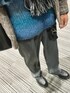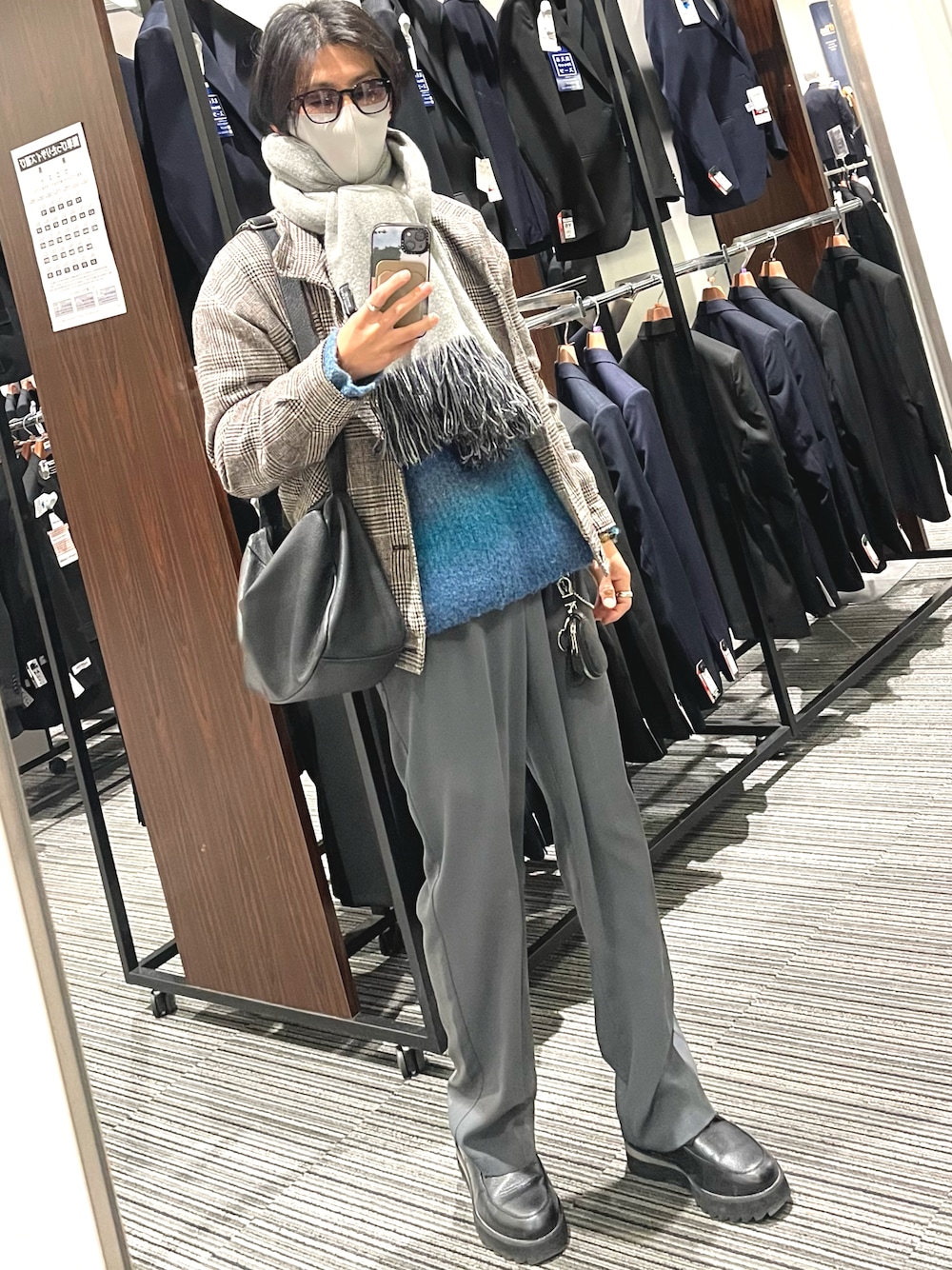 stylishの中にも個性を グレーとブルーのコンビでコーデ グラデニットにチェックのブルゾン スラックスにローファー ショルダーバッグとマフラー サングラスも同系色でまとめて完成