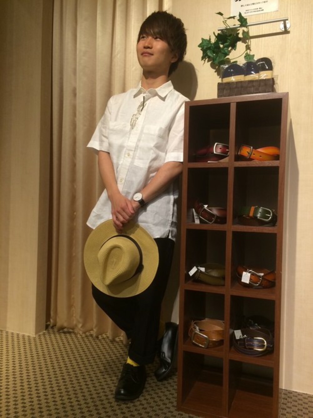 こんにちは! 大津店の渡邉です! 今回はシャツとスラックスを合わせて見ました。 シャツは麻100%でできていて、今の季節でも着やすく、当店でも人気の商品です! 全体的に色がシンプルになり過ぎないために黄色の靴下を合わせたのもポイントです! だんだん暑くなってきましたので、お体には十分お気をつけてくださいね(^-^) では!!!