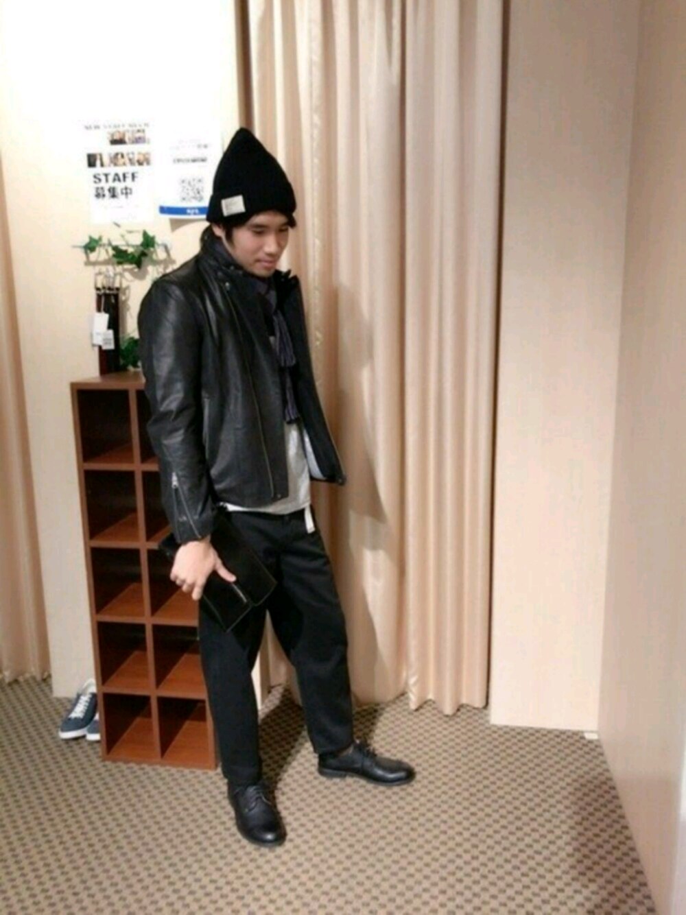 ブラックコーデでシックに合わせました。 ライダーズはレザーで辛めですがニット帽とワイドパンツで甘めに仕上げました。