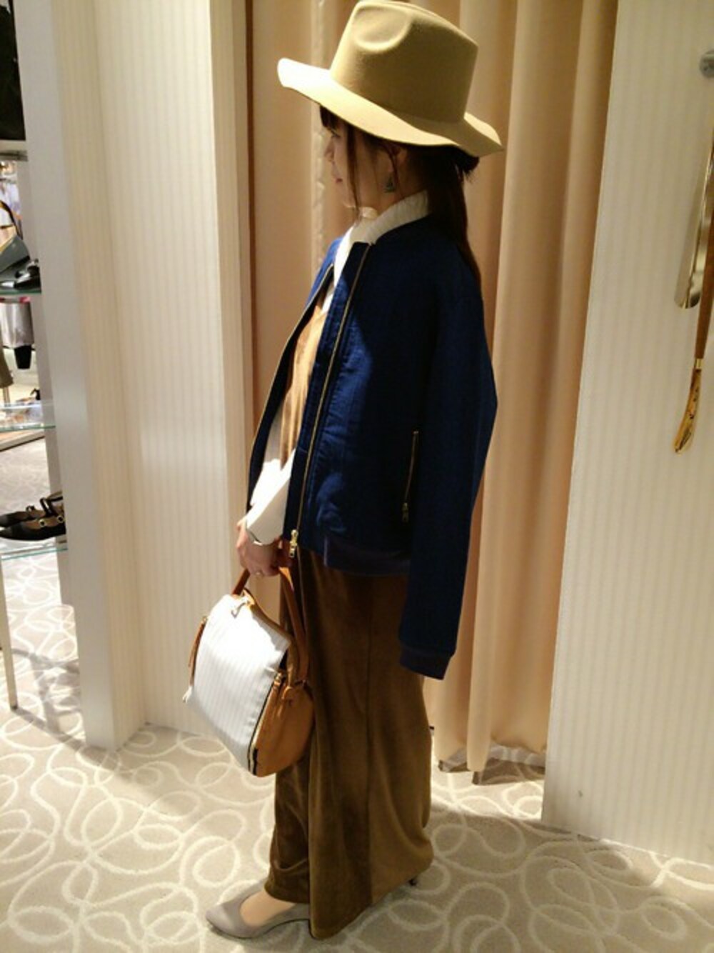 引き続き人気のデニムMA1♪ 今年トレンドのベロア素材のロンパースでコーディネートしました。 オフタートルニットをインにして秋を先取り★ トレンドのデニムとMA1の良いとこどりのライトアウターです。程よい生地感で秋口から春まで着用できるのも嬉しいポイントです♪
