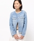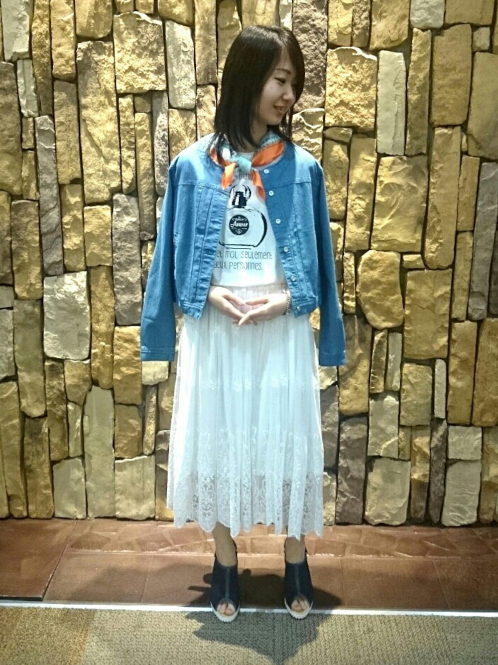 今年イチオシの白×デニムコーデ 襟部分にフリンジのついたノーカラーGジャンにレースのスカートを合わせて春らしい軽やかなコーディネートを組みました 首元にはスカーフを軽く巻いてアクセントを