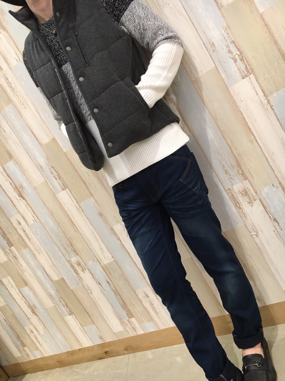 お昼の温かい時間は中綿ベストサイコーです! このベストはモコモコ感が出ないアイテムなので、スッキリスマートに見せれますよ^_^