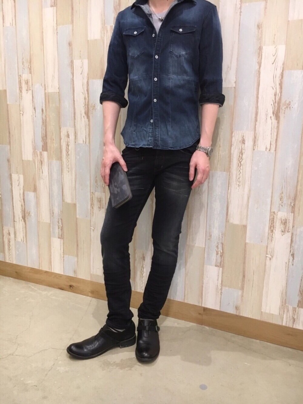 春の新作デニムシャツのスタイルコーデ♫ カバンを持たず、財布を小ちゃいクラッチ代わりに(笑 カモフラ柄のお財布で魅せ財布です! ストレッチの効いたデニムシャツで、スタイリッシュに着れますよ^_^ まだ寒いのでアウターのインナーに重ね着もバッチリ出来ますね(^O^) ヘビロテ間違えなし! 桂川店