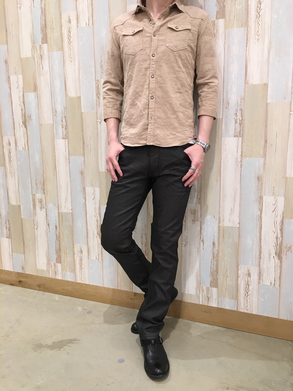 新作七部袖カモフラジャガードシャツ♫ シャツを明るいベージュカラーで春らしく、パンツをモノトーンに落ち着かせた大人コーデ^ - ^