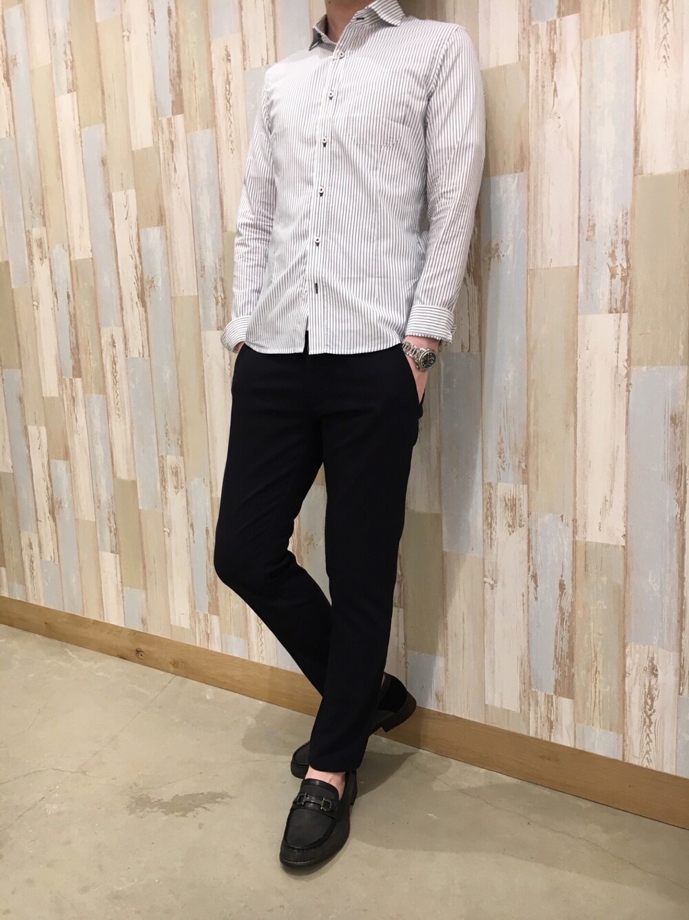 お気に入りイージーパンツとストライプシャツを使ったキレイ目コーデ♫ 足元は9部丈にしてローファーを合わせて春らしく軽いイメージ^_^
