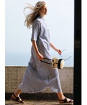ネイビーのストライプが爽やかな夏のワンピーススタイル♪ ゆったりリラックス感のあるワンピースはワイドパンツとのレイヤードもおすすめです。 【 綿麻ストライプワンピース 】 普段サイズ: M / 着用サイズ: M 綿麻素材で程よい肌離れ感。薄すぎない生地なので一枚でもしっかり着ていただけます。 袖は肘が隠れる長さで、ひと折してもアクセントになります。 前を開けて羽織りにするのもおすすめです! 【 強撚レーヨン綿ポリツイルパンツ 】 普段サイズ: M / 着用サイズ: M ロイヤルブルーカラーが目を引くワイドパンツ。 ウエストのタック使いでゆったり穿いていただけます。 コンパクトなトップスと合わせてきれい目なスタイルも◎