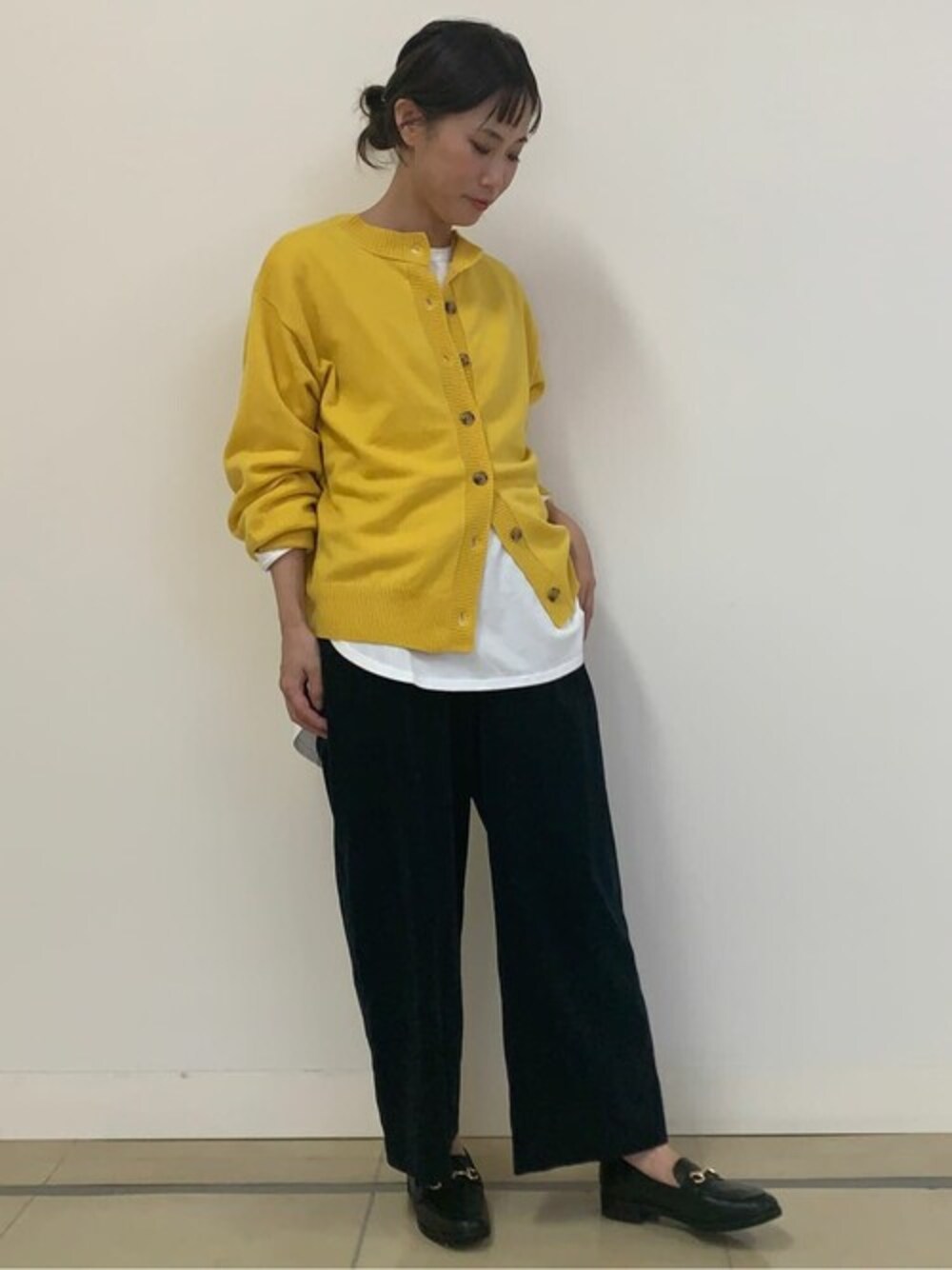 【 ソフトタッチプルオーバー 】 普段サイズ: S / 着用サイズ: M 前後で着られるニットは着回しが抜群です。 お袖や身幅は重ね着がしやすいように少しゆったりとしたサイズ感なので、 ブラウスやカットソーが楽に着て頂けます。 とってもきれいな色味なので、コーディネートのアクセントとしておススメです。 【 コットンロングプルオーバー 】 普段サイズ: S / 着用サイズ: M 前後差のあるカットソーなので、ワイドパンツにも細身のパンツにもどちらでも相性良くコーディネートできます。 長すぎない着丈なので、レイヤードスタイルも取り入れやすくなっています。 【 エアーコールパンツ 】 普段サイズ: S / 着用サイズ: S 柔らかく、とても軽い着心地です。 丈を少しスッキリと見えるようにサイドのボタンで調整をして短くしています。 生地が柔らかいので、広がり過ぎずバランス良くお召し頂けます。 【 オリジナルローファー 】 普段サイズ: 23.5 / 着用サイズ: 23.5 硬すぎないので、履きやすい履き心地です。 幅も細過ぎないの窮屈感がなく履いて頂けます。