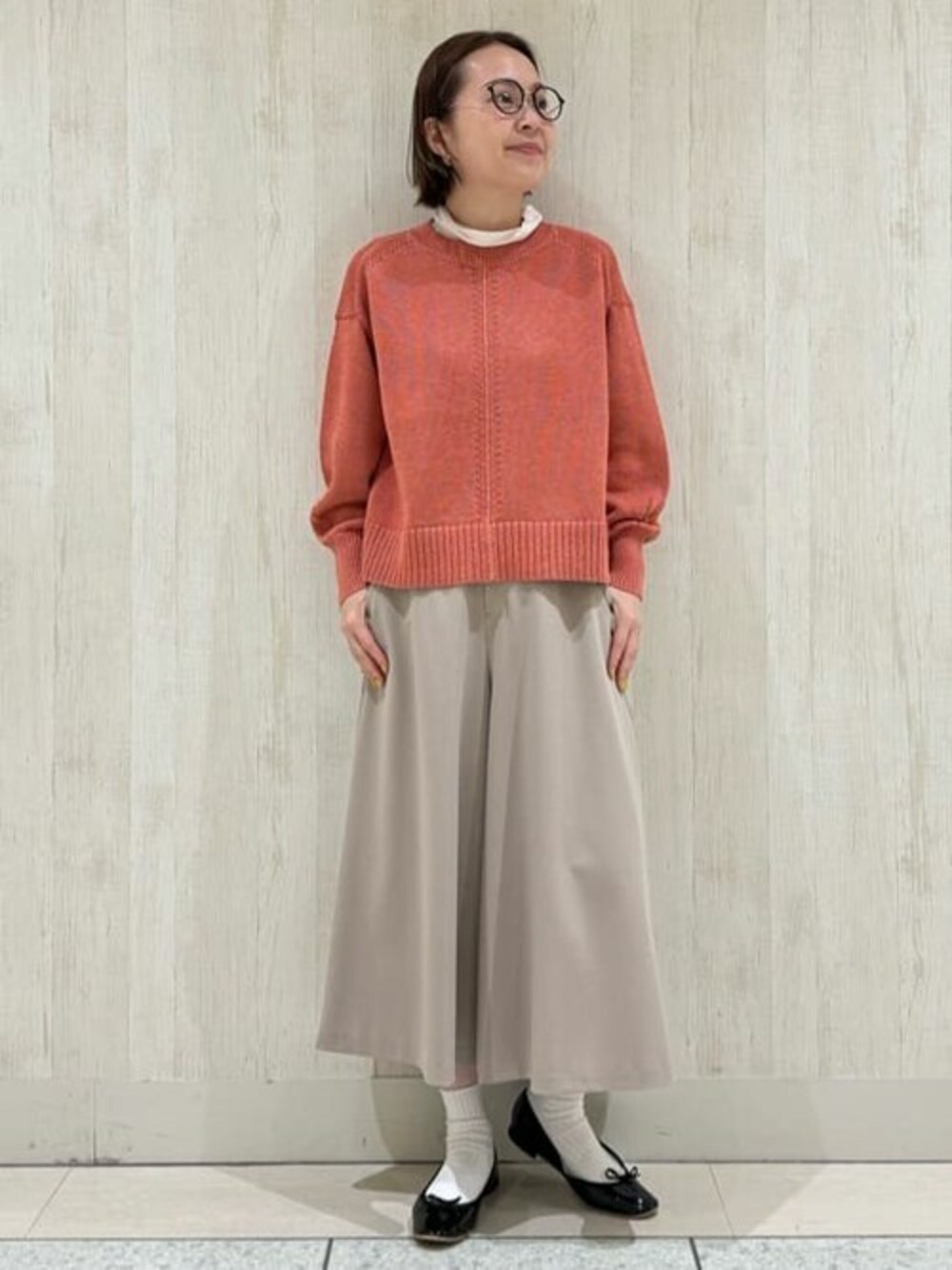 【 ギマコットンプルオーバー 】 普段サイズ: S / 着用サイズ: M コットン素材で麻網のような風合いの生地です。 着心地は軽く、見た目よりもごわつきを気にせず着られます。長すぎず短すぎず使いやすい着丈になっているため、ボトムスを選ばないのも嬉しいです。 どのカラーも取り入れやすく、着用カラーは肌なじみしやすく春らしい優しい色味でオススメです。 【 ツイルストレッチスカーチョ 】 普段サイズ: S / 着用サイズ: S とても軽く柔らかい着心地で、腰周りのゴムなのでノンストレスで落ち感がキレイです。 シワが付きにくいのと程よいツヤ感がきちんと感を演出してくれるので、お仕事使いやお出かけにも着れます。小柄な方でもバランス良く見えるところも◎ とろみブラウスや丈の短いトップスと合わせると、160cm前後の方でも縦のシルエットがキレイにまとまります。トレーナーとスニーカー合わせで大人カジュアルな着こなしもオススメです♪