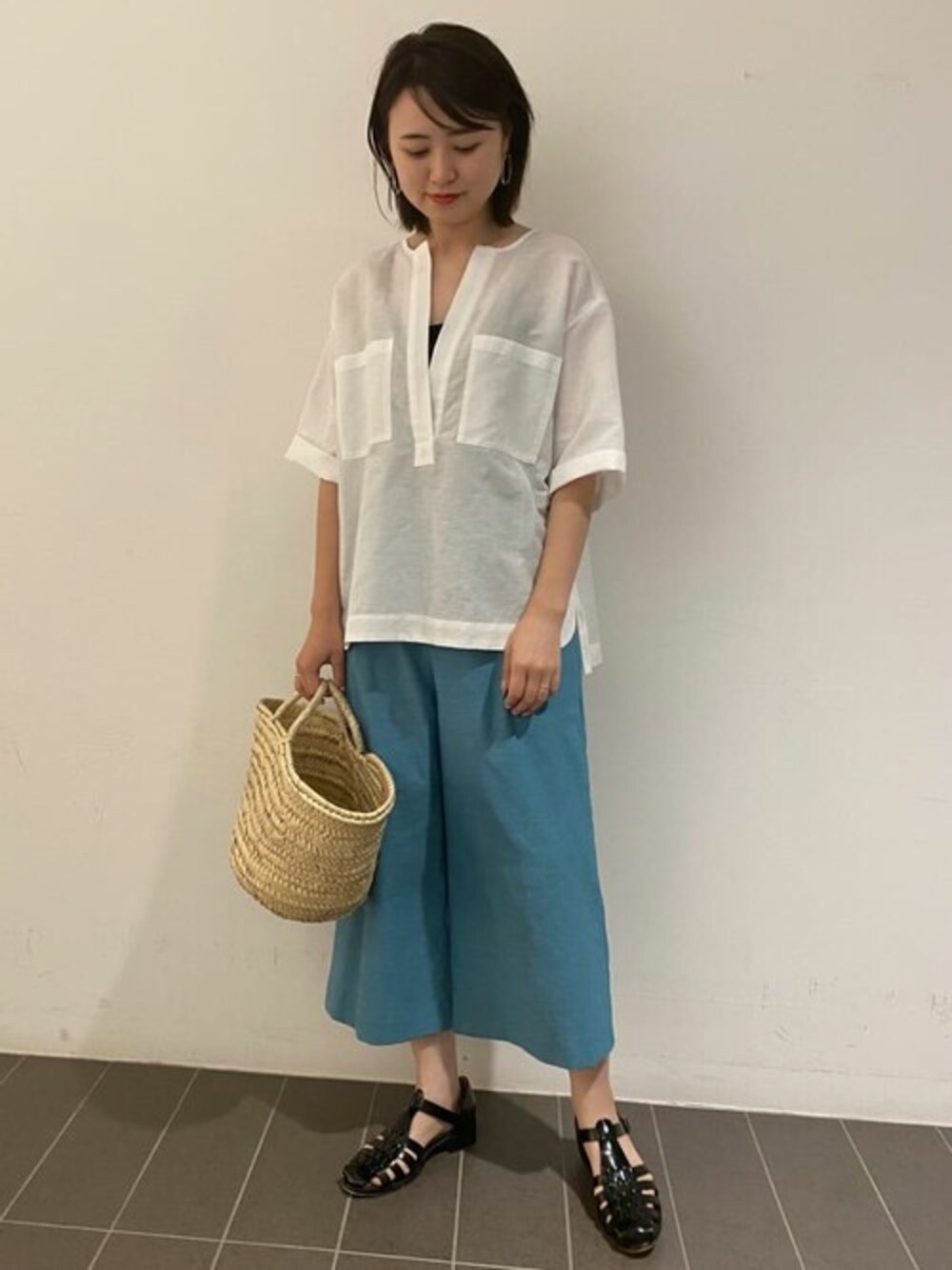 【 ユーティリティブラウス 】 普段サイズ: M / 着用サイズ: M 生地にハリ感があり、シャリっとしています サイドもスリットが入っていて体のラインを拾わないシルエットです。 お尻まですっぽり隠れるので、細身パンツでスッキリ着ていただくのもオススメです! 透け感はあるので、インナーも同系色系で合わすとよりシックにお召しいただけます。 【 クールマックス綿麻オックスパンツ 】 普段サイズ: S / 着用サイズ: S カラーポイントになるパンツで、カラーのバリエーションも豊富です! 後ろにゴムも入っているのでウエストも楽に履いていただけます サイドに絞りもあるためウエスト調節も可能です。 ワイドすぎずスッキリしているのでオーバーめなトップスとも合わせやすいです♪ 夏らしくサラッとしたドライな履き心地です!