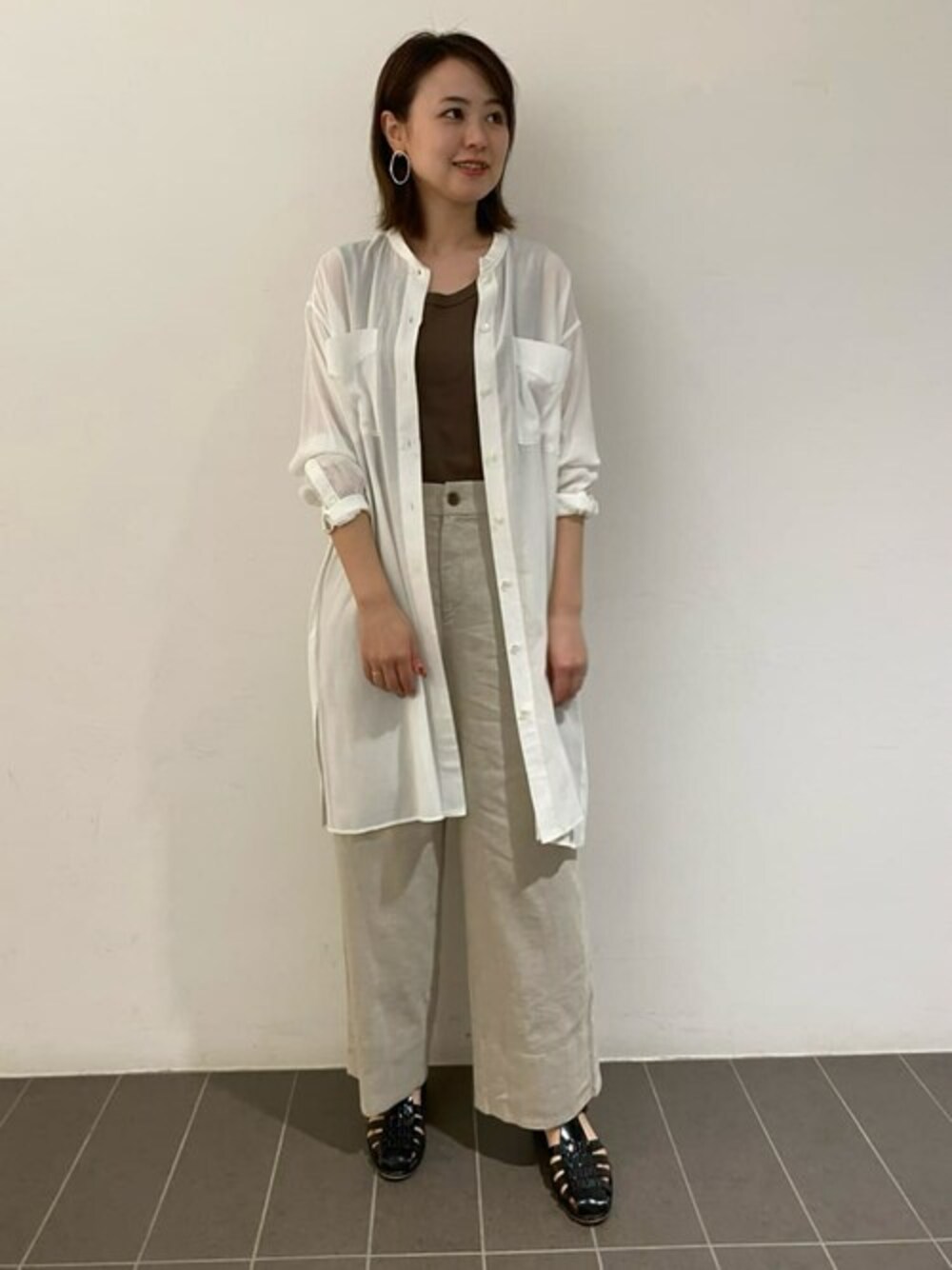 【 シアーロングシャツ 】 普段サイズ: M / 着用サイズ: M 長袖のロングシャツです♪ シアー素材なのでとても軽く風通しも抜群‼︎ 袖丈も欲しいという方にもオススメです♪ 前を止めて着ていただいても、羽織りとしも着回しのきくシャツなので 一枚あると万能です♪ 【 オーガニックコットンベアテレコタンクトップ 】 普段サイズ: M / 着用サイズ: M 一枚でもしっかりとした程よい厚みのあるインナーです! アームラインもフィットしやすく肩の部分も太めなので安心感もあります。 【 麻混ワイドパンツ 】 普段サイズ: S / 着用サイズ: S 麻混ですが、肌に当たった感じはチクチク感は無くサラッとした質感でした◎ 私の身長でくるぶし隠れるくらいなのですが、シルエットもワイド過ぎず スッキリしているので足長効果あり♪ 洗濯機でお洗濯していただけるのもオススメポイントです♪