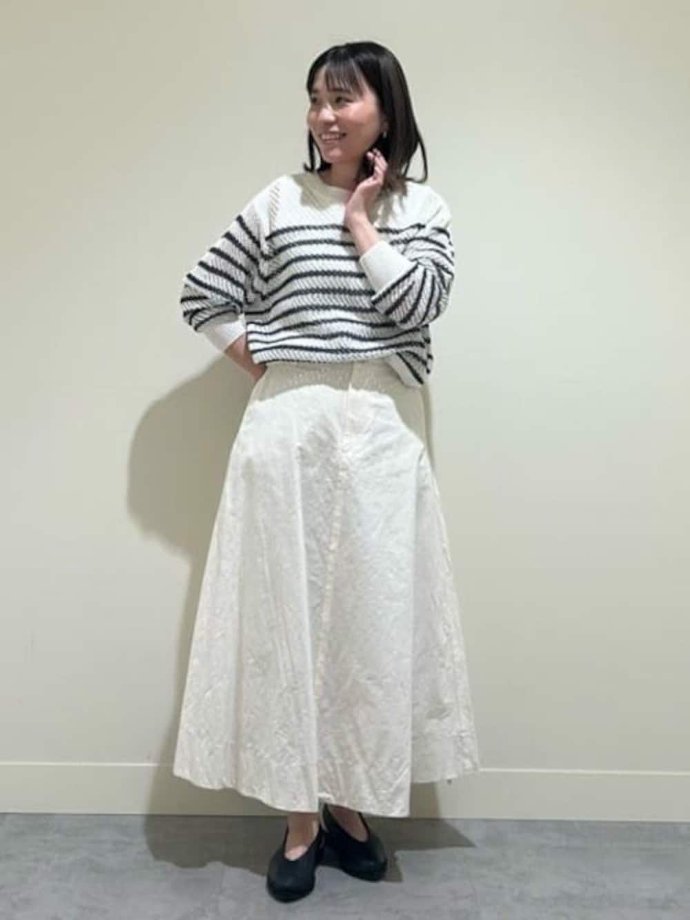【 メッシュボーダーニット 】 普段サイズ: M / 着用サイズ: M 着心地:さらっとしたタッチでハリがあるので、ジメジメとした暑い時期にも着られるニットです。透け感はありますが、タンクトップを着てちょうどいいです。 サイズ感:全体的に身幅はゆったりしていて肌離れしているので体のラインも拾わずスッキリ着れます。 【 近江晒フレアスカート 】 普段サイズ: S.M / 着用サイズ: M 着心地:程よいふくらみとドライ感のあるナチュラルな素材です。細かいシワ加工があるので座りジワも気になりにくいです。 サイズ感:スカートはSサイズも履きますが、ウエスト周りがスッキリしたサイズ感なのでMサイズでも問題ありませんでした。少しゆったり履きたい方はワンサイズUPもおすすめです。