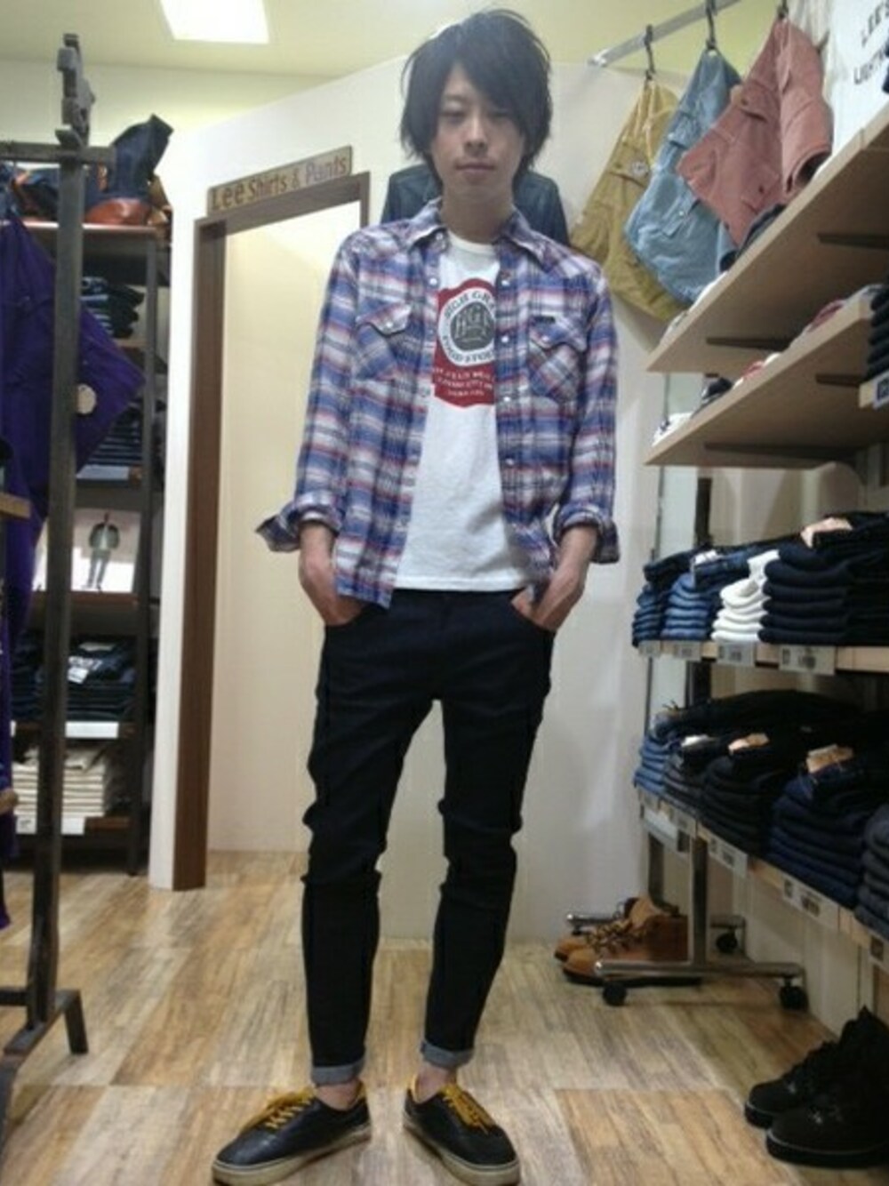 スッキリとしたシルエットで大人気のボトムに定番のTシャツ&チェックシャツコーディネート。全体的にスッキリとした印象です!