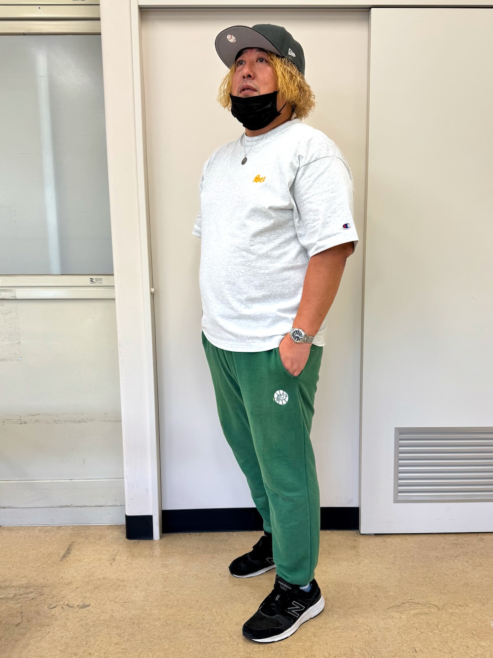 WIND AND SEA × Champion のTシャツに、グリーンのスウェットで抜け感を。 黒のNBで締めて、大人ストリートな夏コーデ。 キャップとTシャツのグレートーンリンクがお気に入り。