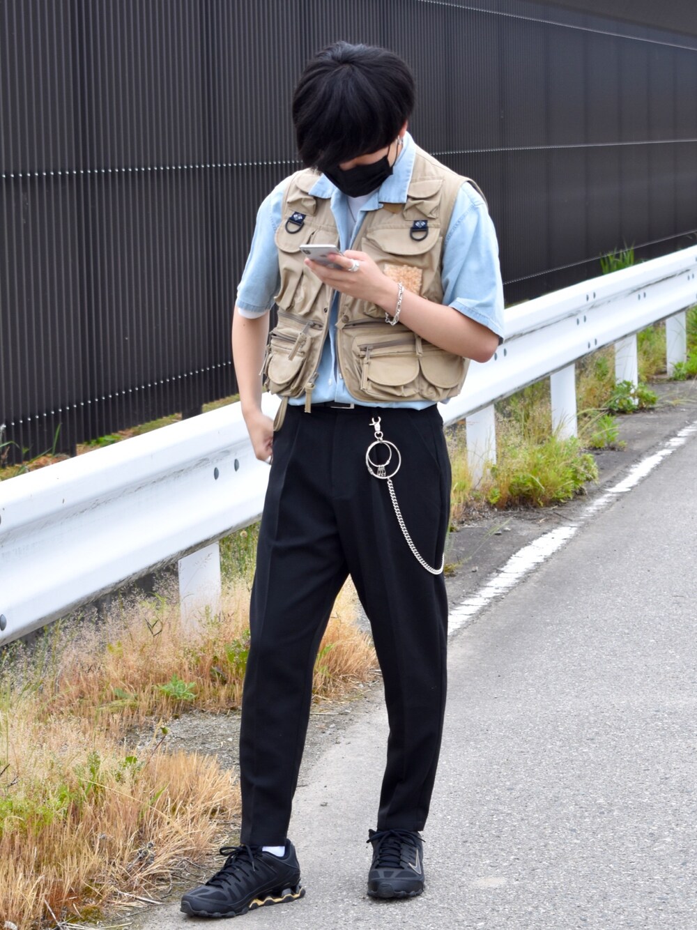 ジャラジャラしたっていいじゃない 今回はベージュのベストに淡いブルーのオープンカラーシャツを合わせました NIKEの靴がお気に入り Instagram⇒k.96nta