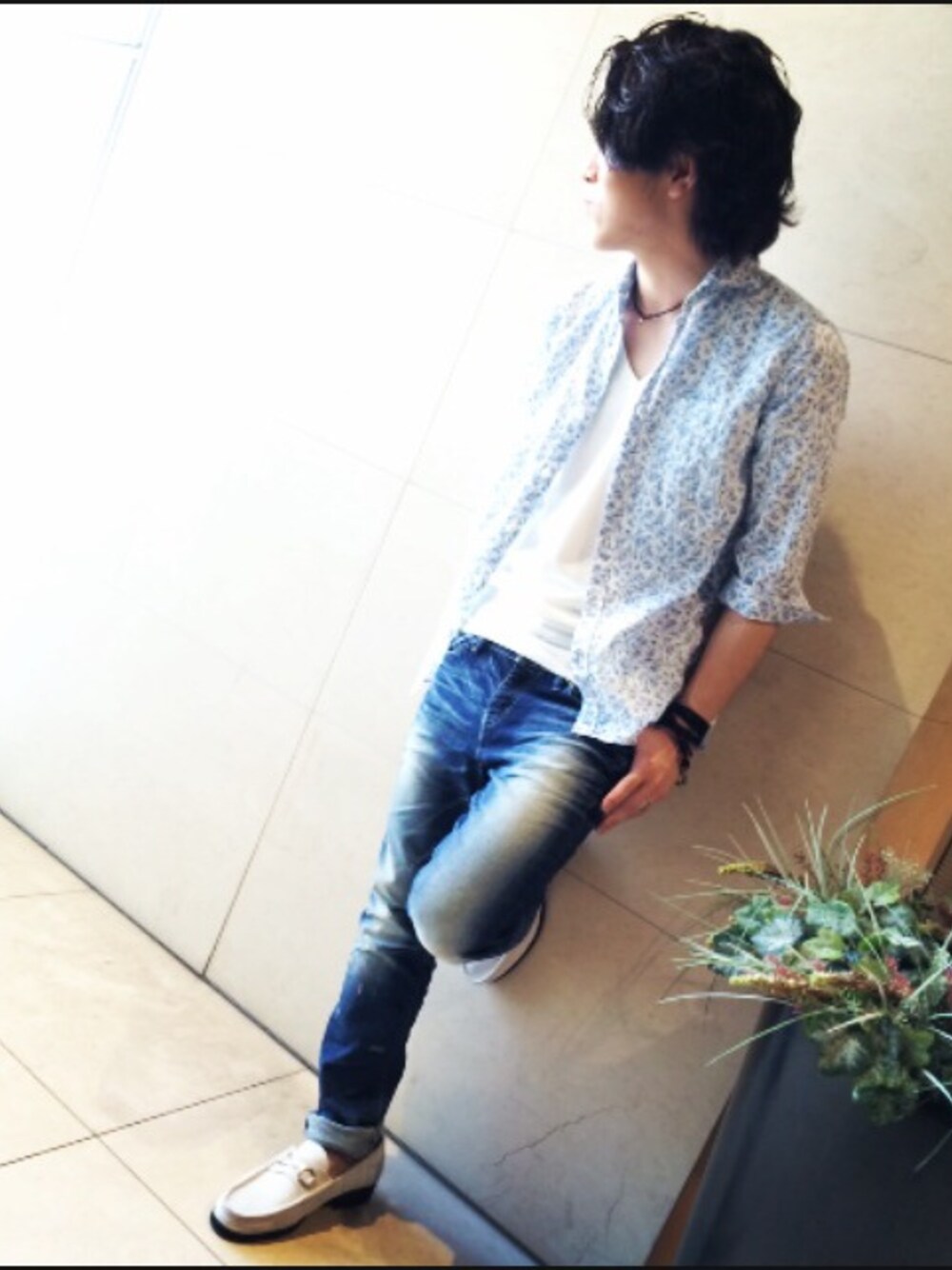 ブルー系のシャツ/ブラウスを着用したメンズの春コーディネートの1枚目の写真