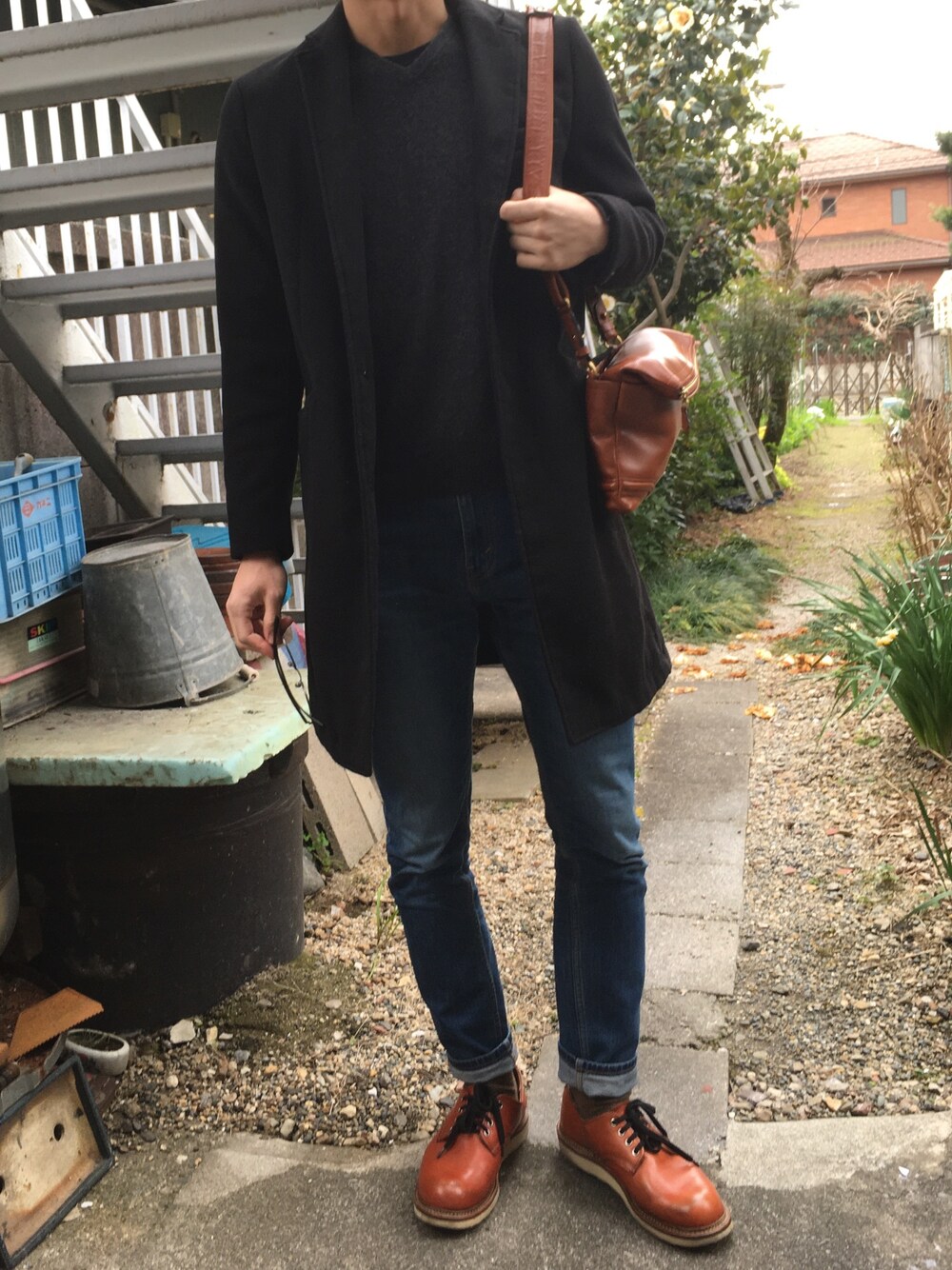 ファイブウッズ のショルダー 持ち運び安く高級感がありロングコートにもあって最高✨ シンプルなコーデにも合います✨ 下から撮ると全く体型違って見えるなー