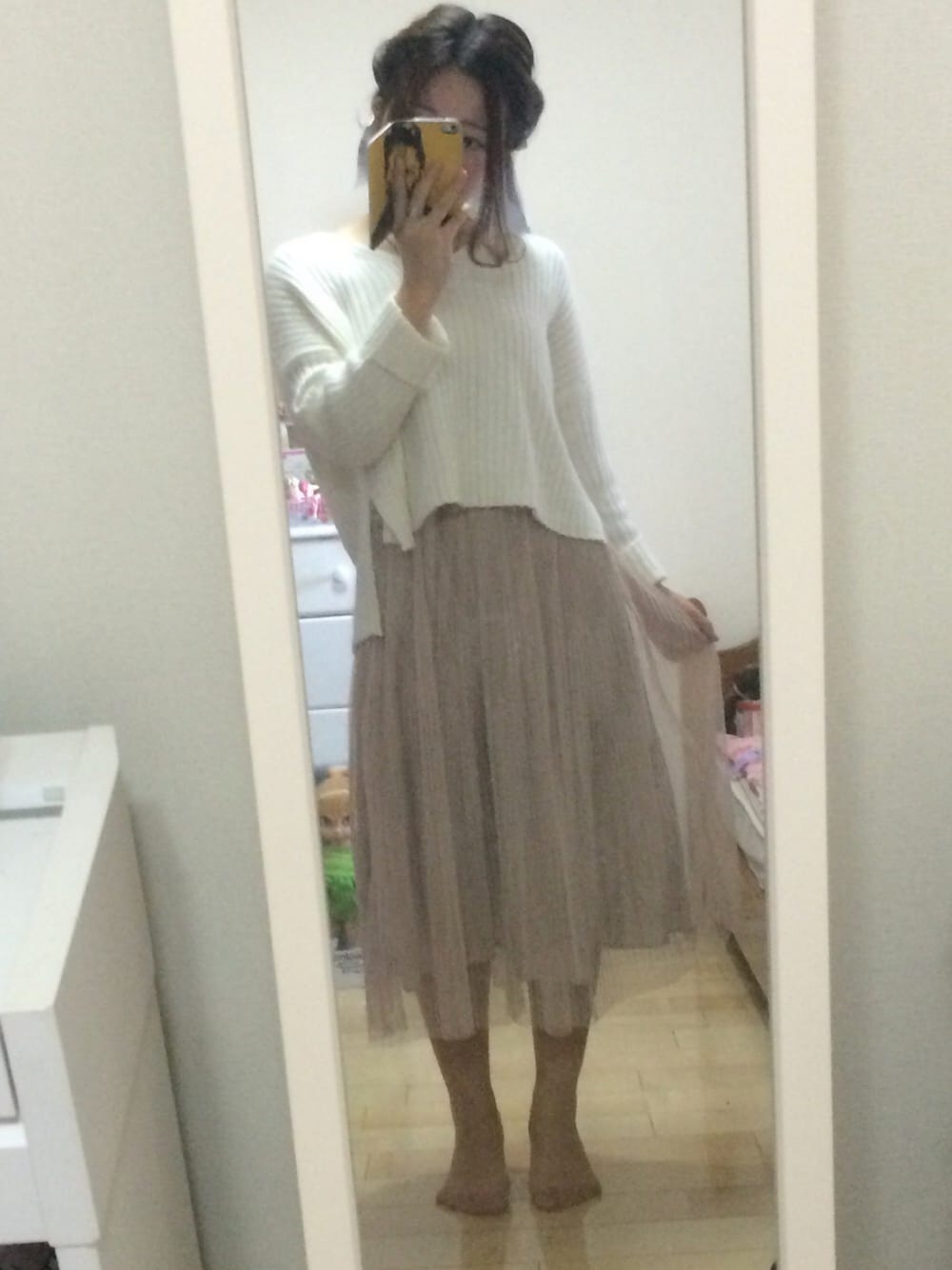 今日は上下どちらもココディール♪ 寒くなってきたからふあふあニット♡ 白ニットは王道かあいい(*´꒳`*) スカートはワンピースみたいになってて単品でも可愛いの\(^o^)/ 細かくて繊細なラインがお気に入り☆ 髪の毛はくるりんぱを応用したふわふわまとめ髪! おっきなリボンもついてます(*^^*)