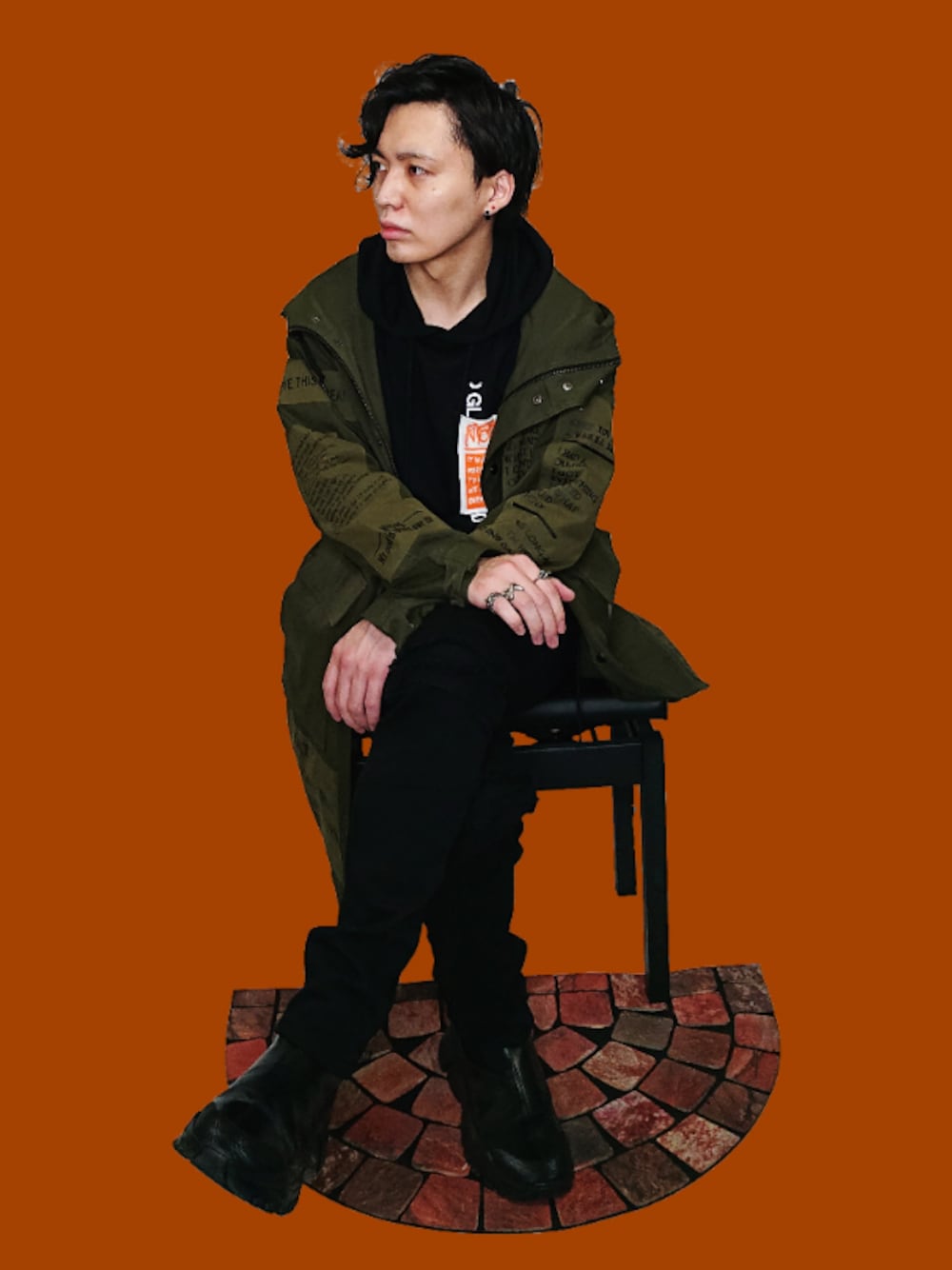 テキスタイルや、パッチワークがされた個性的なモッズコート。どうしても地味になってしまうカーキを中をブラックで統一する事でロックなテイストに。