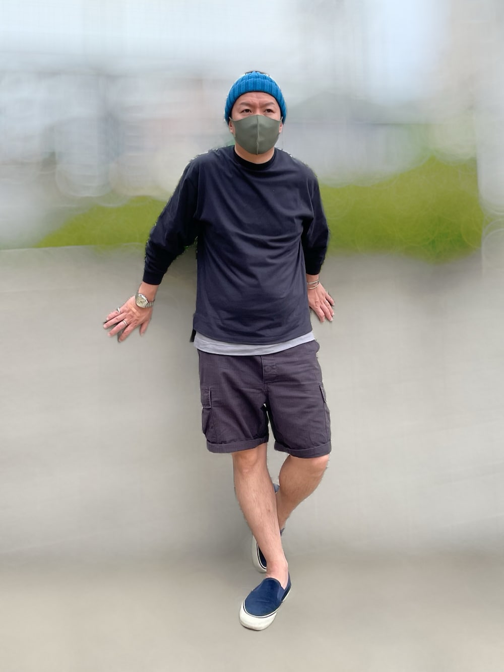 数多いスナップの中から私のスナップをご覧いただきましてありがとうございます😊トップスのカットソーはレディースです。実は両脇が空いているカットソーの為、通気性良しです👌墨黒トップスと炭黒ショーツの間にグレーを挿んで軽さを意識しました🖍