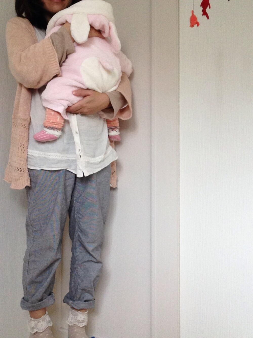 今日はベビーマッサージ教室に参加なのでゆったりパンツスタイルにしました(^^)娘はピンクのうさぎの着ぐるみと白のロンパースと、ピンクの靴下とレッグウォーマー、お花柄のスタイです。