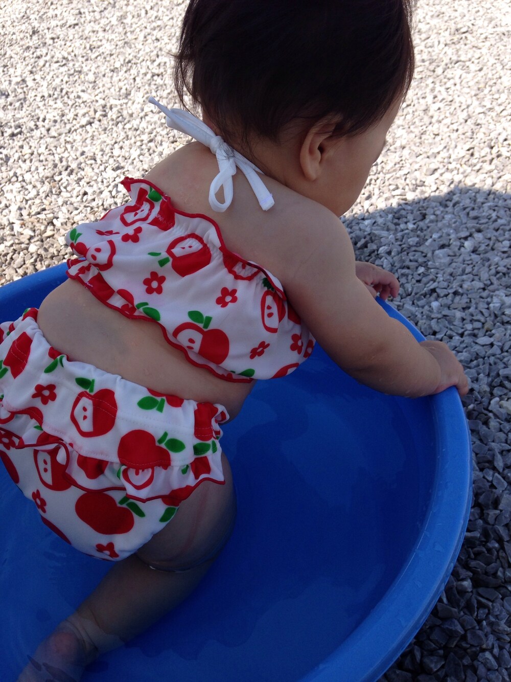 今日は実家でお水遊びしてきました(^O^) 前は泣いちゃったけど今日は楽しそうに入ってくれて良かった☆ 布おむつカバーでいつも愛用してるニシキのオム水着。来年も着られるといいな。無理かな?