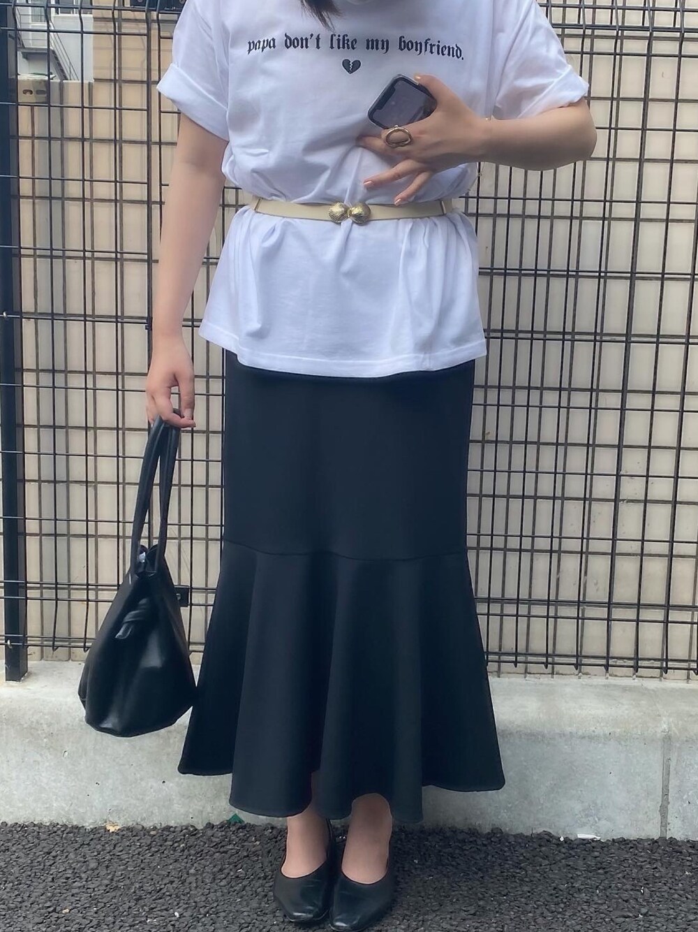 お気に入りのTシャツとマーメイドスカート♡ あえてインしないでベルトで締めて スタイルアップ効果を期待した🐾