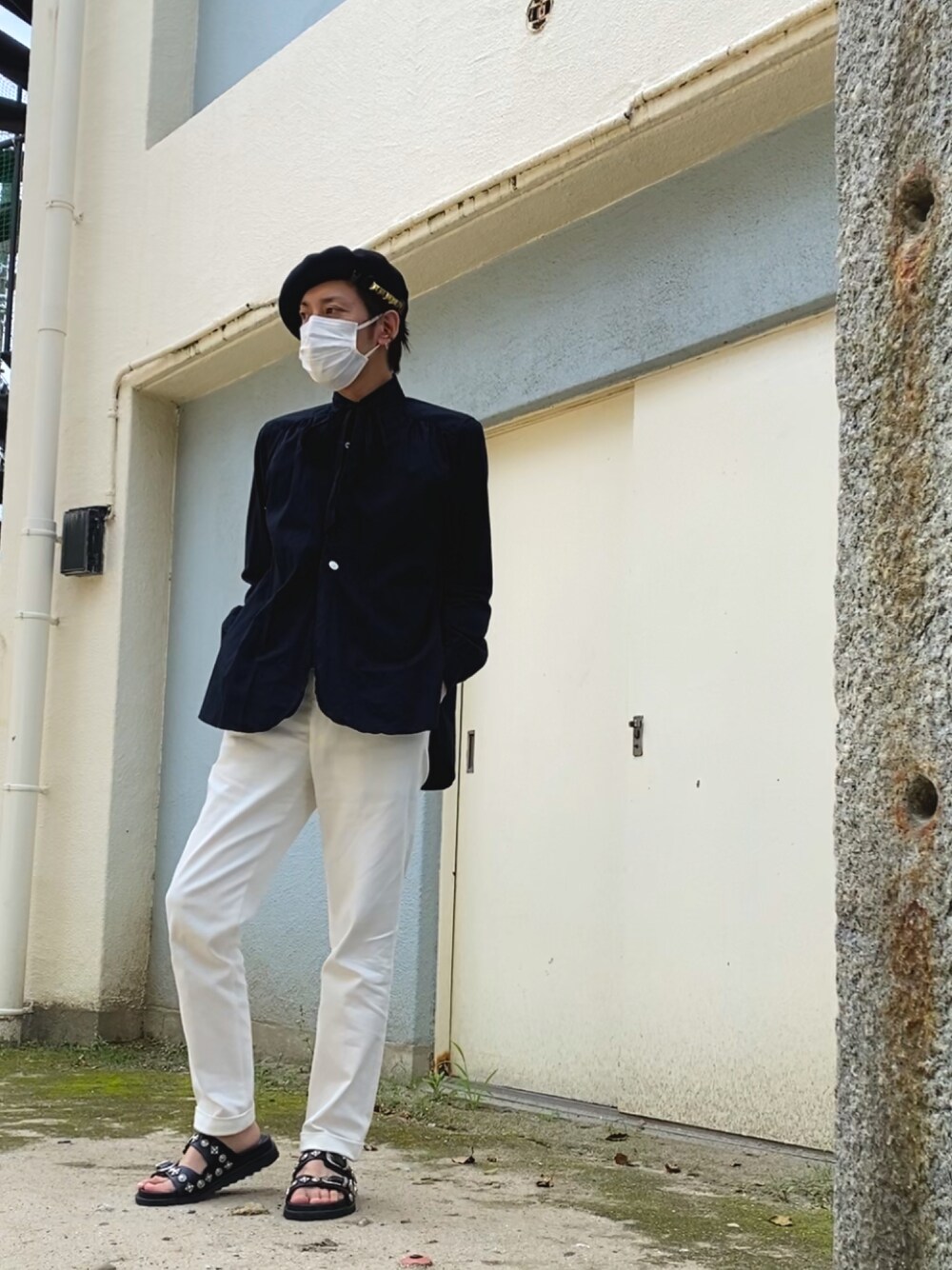 こんにちは。 今日はキレイめモノトーンコーデです。 と、言いつつインナーにパープルの差し色入ってます。笑 アスコットカラーのシャツにスラックス型のホワイトデニムというキレイめアイテム目白押しという事で、ベレー帽とサンダルでバランス取りました。 たぶん、体型を選ばずその人の個性で色んな雰囲気になるコーデではないかと。 このシャツは裾がオープンなのでインナーで遊べます。 問題は写真だとアスコットカラー(リボン部分)が良く分かんない事ですかね。 とりあえず諦めました。笑