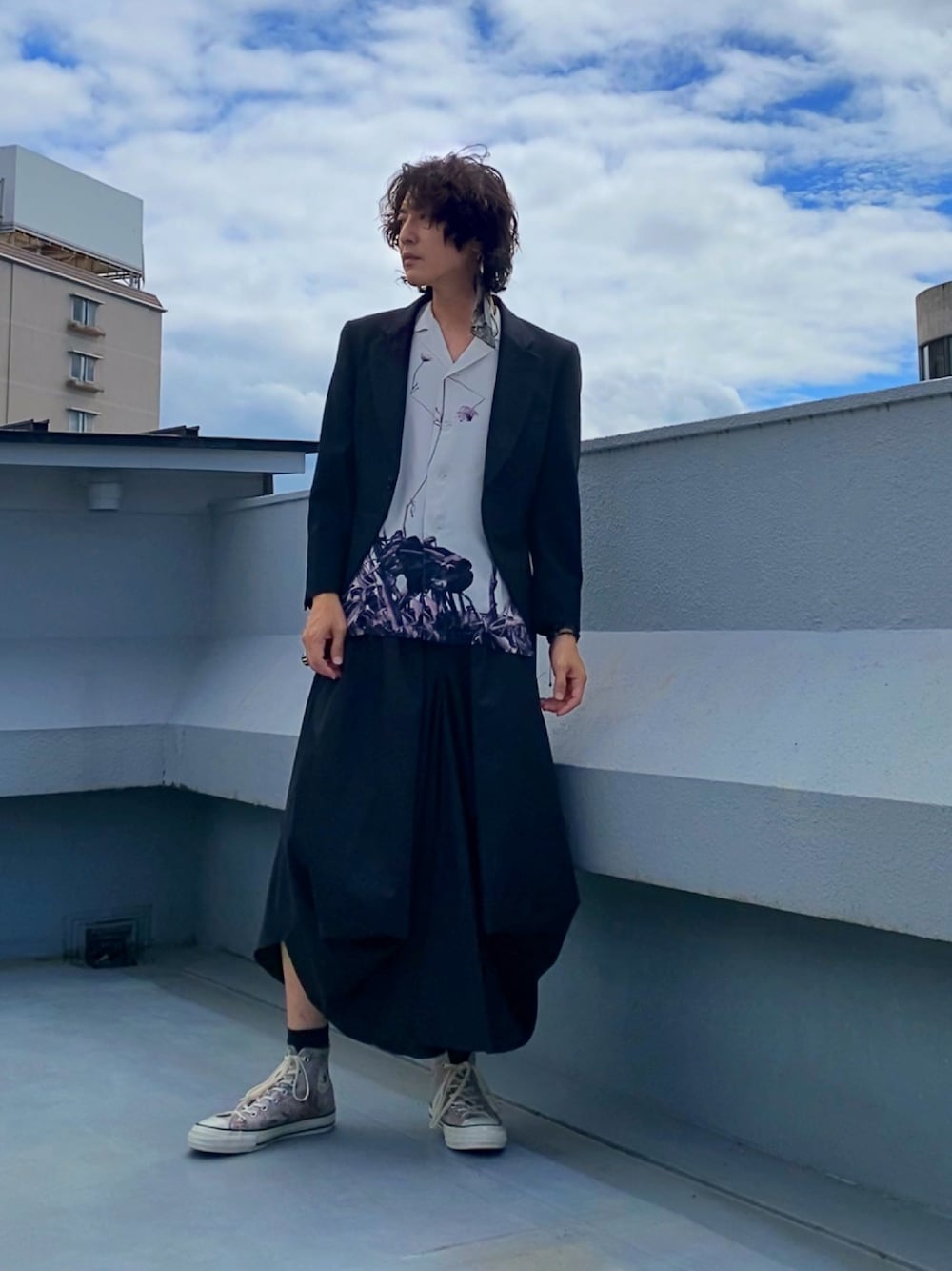 こんにちは。 以前対バンやらRECやらライブハウスやらで お世話になった先輩に先日声をかけて頂き、 オリジナルを演ってたバンドで5年振りに ライブをしてきました。 今回バンド内で衣装は黒ジャケという縛りを設けられていて。 そしてステージでの転倒防止にスニーカーをチョイス。 おや、テーラードにスニーカーというのはギャルソンっぽい。 という完全なる偏見によってスカートを合わせました。 結果的に「アンタいつも通りやがな🫱」というコーデ。