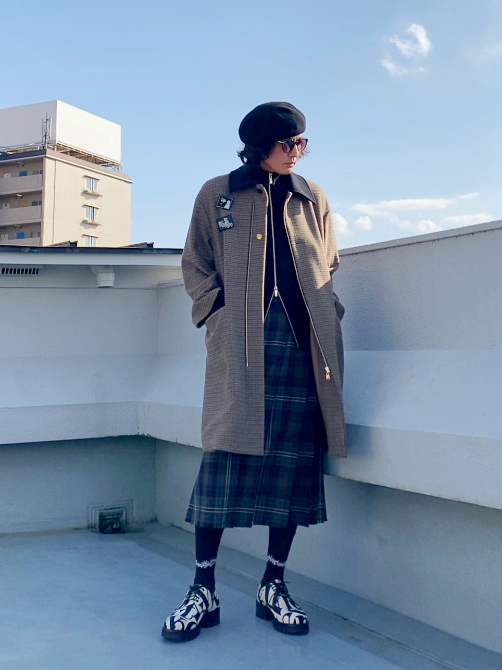 こんにちは。 2週間悩んでお迎えしたキルトスカートは 前回のポストで見に行ったアイテム。 ドライバーズニットでキレイめ要素が強くなったので ベレーやサングラス、シューズなどを力強いアイテムにして メンズファッションの枠に収まるよう気をつけました。 ショート丈のコートなんかも合いそう。